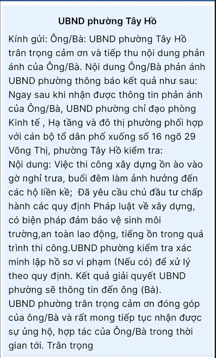 Vụ việc đã trải qua hàng loạt văn bản qua lại giữa các cơ quan có thẩm quyền. Trước đây, UBND phường Bưởi báo cáo vi phạm và hứa khắc phục. Hiện nay, UBND phường Tây Hồ cũng khẳng định sẽ rà soát, xử lý công trình sai phạm (nếu có). Trong khi đó, Sở Xây dựng Hà Nội nhiều lần có văn bản chuyển thông tin phản ánh, yêu cầu xử lý nghiêm và báo cáo kết quả.
