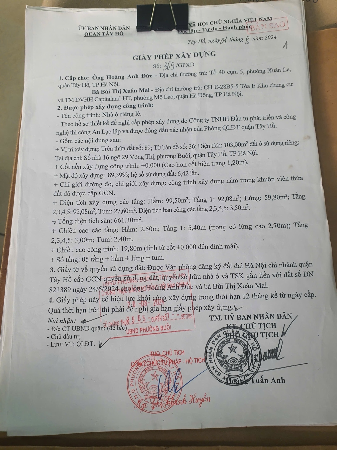Theo phản ánh của người dân, công trình xây dựng nhà ở riêng lẻ nhiều tầng tại số 16 ngõ 29 Võng Thị thuộc sở hữu của ông Hoàng Anh Đức và bà Bùi Thị Xuân Mai. Công trình được cấp Giấy phép xây dựng số 369/GPXD ngày 01/8/2024 với quy mô 5 tầng, 1 hầm, 1 lửng và 1 tum.