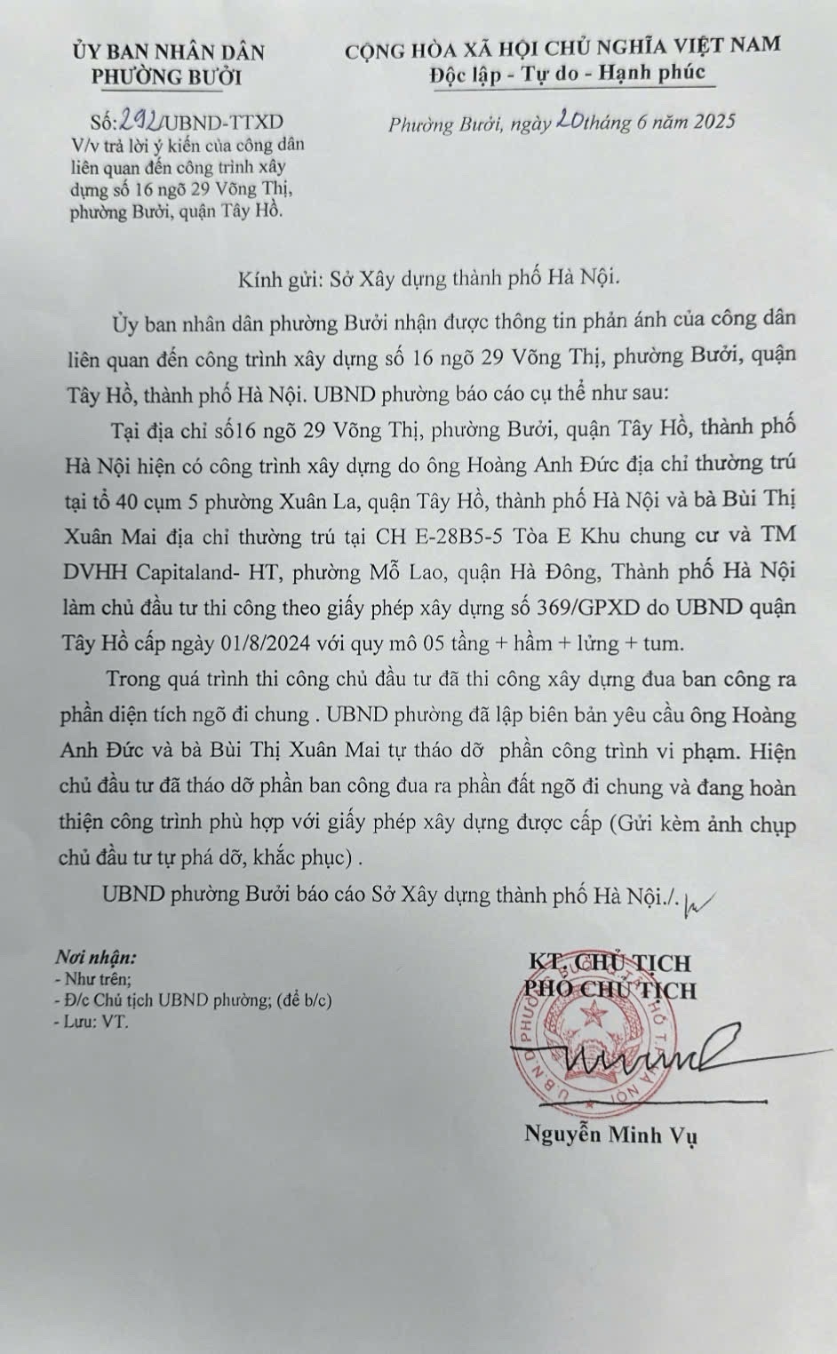 Ngay sau khi nhận được phản ánh, UBND phường Bưởi (trước khi sáp nhập địa giới) đã cử lực lượng xuống kiểm tra. Biên bản lập cho thấy chủ đầu tư có hành vi vi phạm khi xây dựng lấn chiếm diện tích ngõ đi chung. UBND phường đã yêu cầu tháo dỡ phần công trình vi phạm và khắc phục.