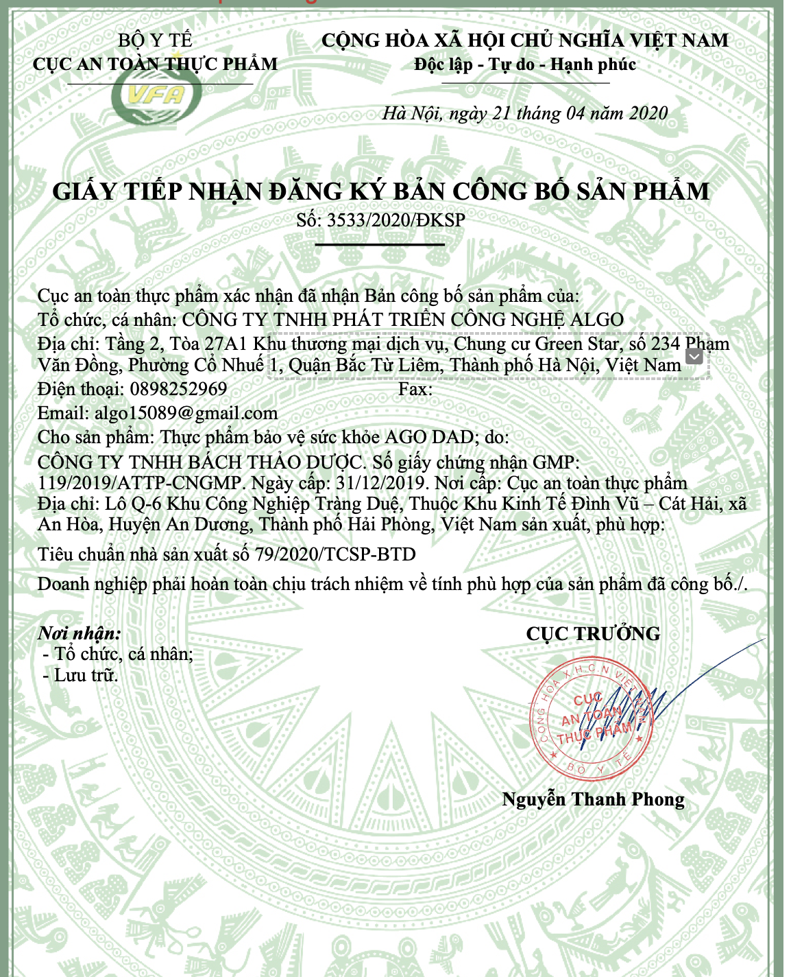 Giấy tiếp nhận đăng ký công bố sản phẩm do ông Nguyễn Thanh Phong ký và đóng dấu cho Công ty ALGO