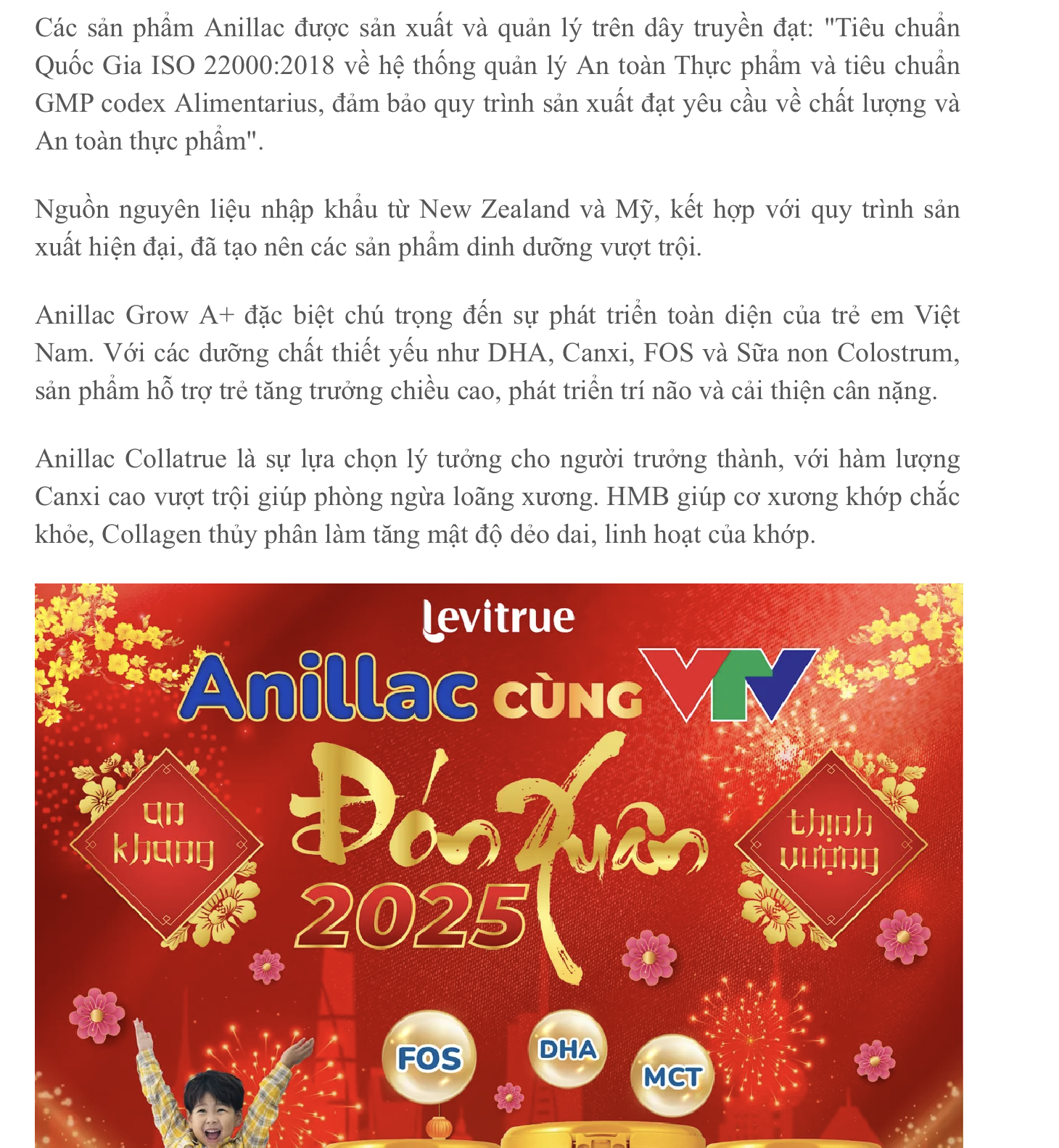 Một dòng sản phẩm khác do Công ty Levitrue phân phối là Anillac từng quảng cáo rầm rộ trên truyền thông cũng đã xoá hết thông tin sản phẩm trên website