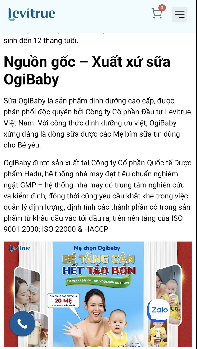 Thông tin dòng sản phẩm sữa Ogi Baby trên website Công ty Levitrue Việt Nam
