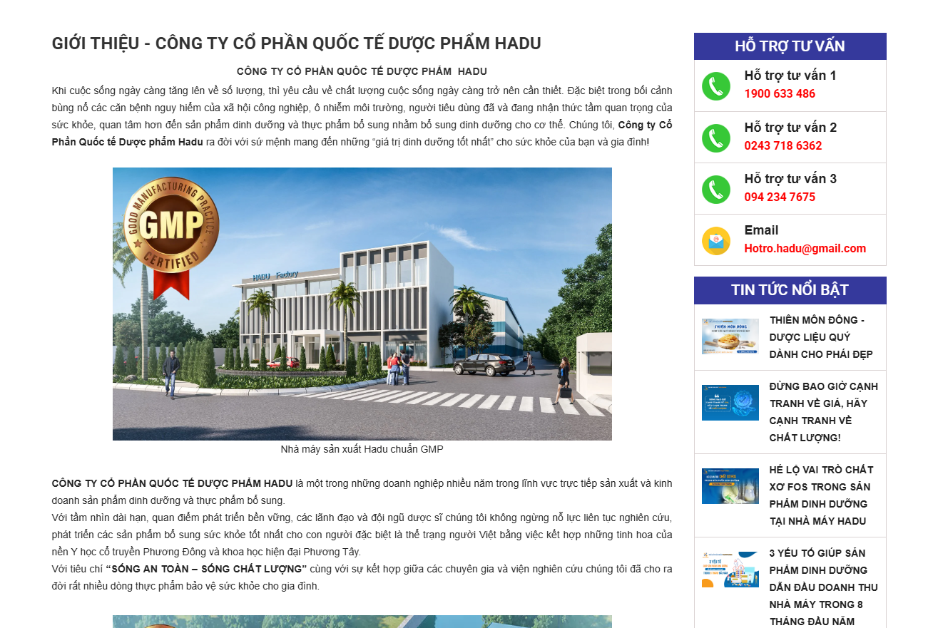 Tuy nhiên trên thực tế, sản phẩm này được sản xuất tại một đơn vị trong nước là Công ty Cổ phần Quốc tế Dược phẩm Hadu (địa chỉ: Lô CN20, Cụm công nghiệp Lương Điều, Cẩm Giàng, Hải Dương).