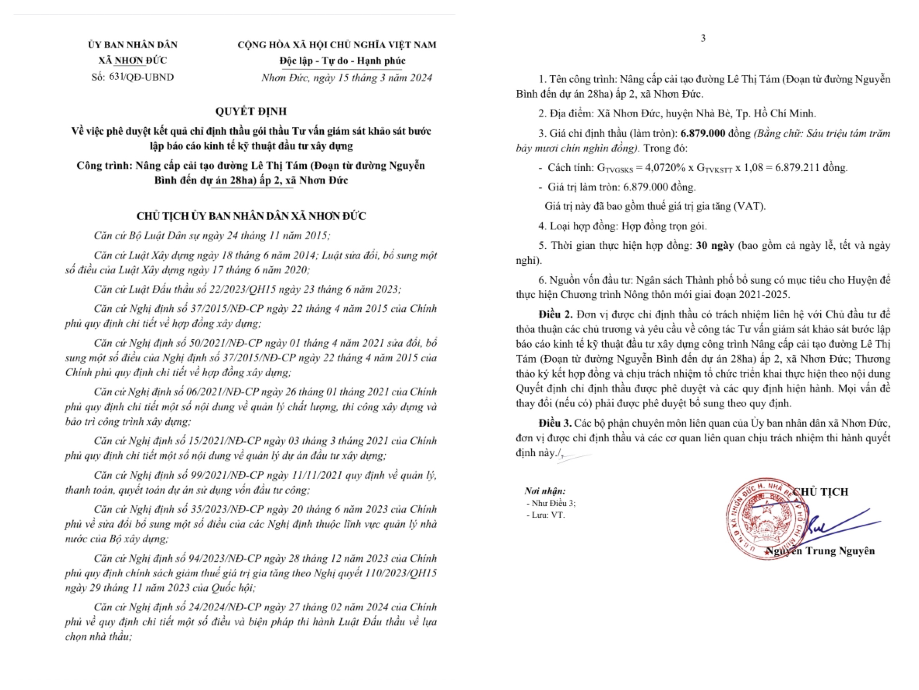 Đơn cử như ngày 15/3, tại kế hoạch lựa chọn nhà thầu, giai đoạn chuẩn bị đầu tư công trình: Nâng cấp cải tạo đường Lê Thị Tám (đoạn từ đường Nguyễn Bình đến Dự án 28 ha), Ấp 2, xã Nhơn Đức, gói thầu tư vấn giám sát khảo sát bước lập báo cáo kinh tế kỹ thuật, Tân Đại Tín được UBND xã Nhơn Đức chỉ định thầu với giá 6.879.000 đồng, thực hiện trong 30 ngày.