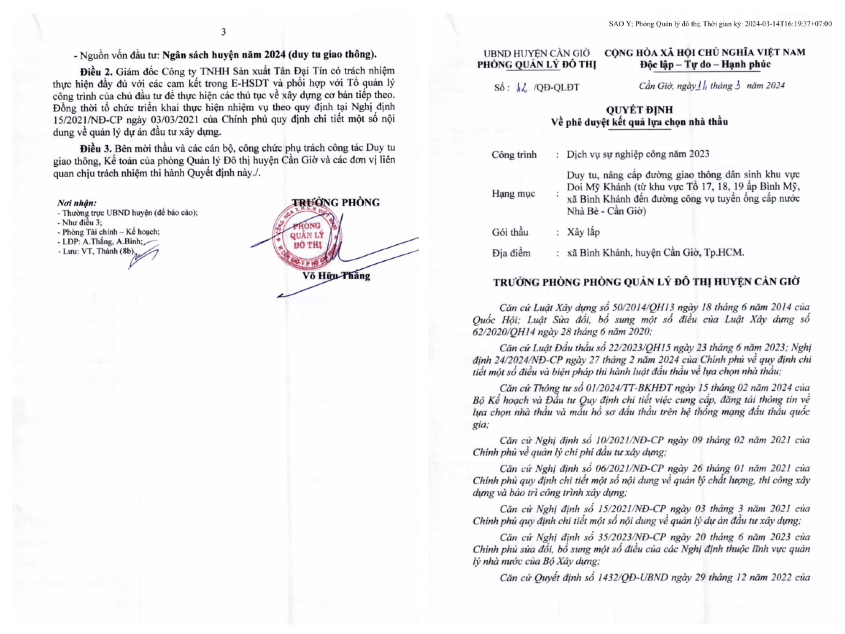 Cụ thể, ngày 14/3/2024, Trưởng phòng Phòng quản ký đô thị huyện Cần Giờ Võ Hữu Thắng ký quyết định Gói thầu xây lắp dịch vụ sự nghiệp công năm 2023, hạng mục duy tu nâng cấp đường giao thông dân sinh khu vực Doi Mỹ Khánh (từ khu vực tổ 17, 18, 19 ấp Bình Mỹ, xã Bình Khánh đến đường công vụ tuyến ống cấp nước Nhà Bè - Cần Giờ).