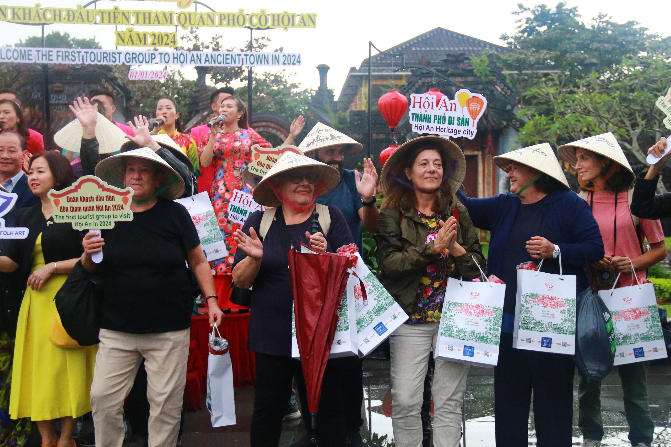 Cũng trong sáng 1/1/2024, Thành phố Hội An (tỉnh Quảng Nam) tổ chức chào mừng đoàn khách 19 người đến từ Ý "xông đất" đầu năm mới 2024.