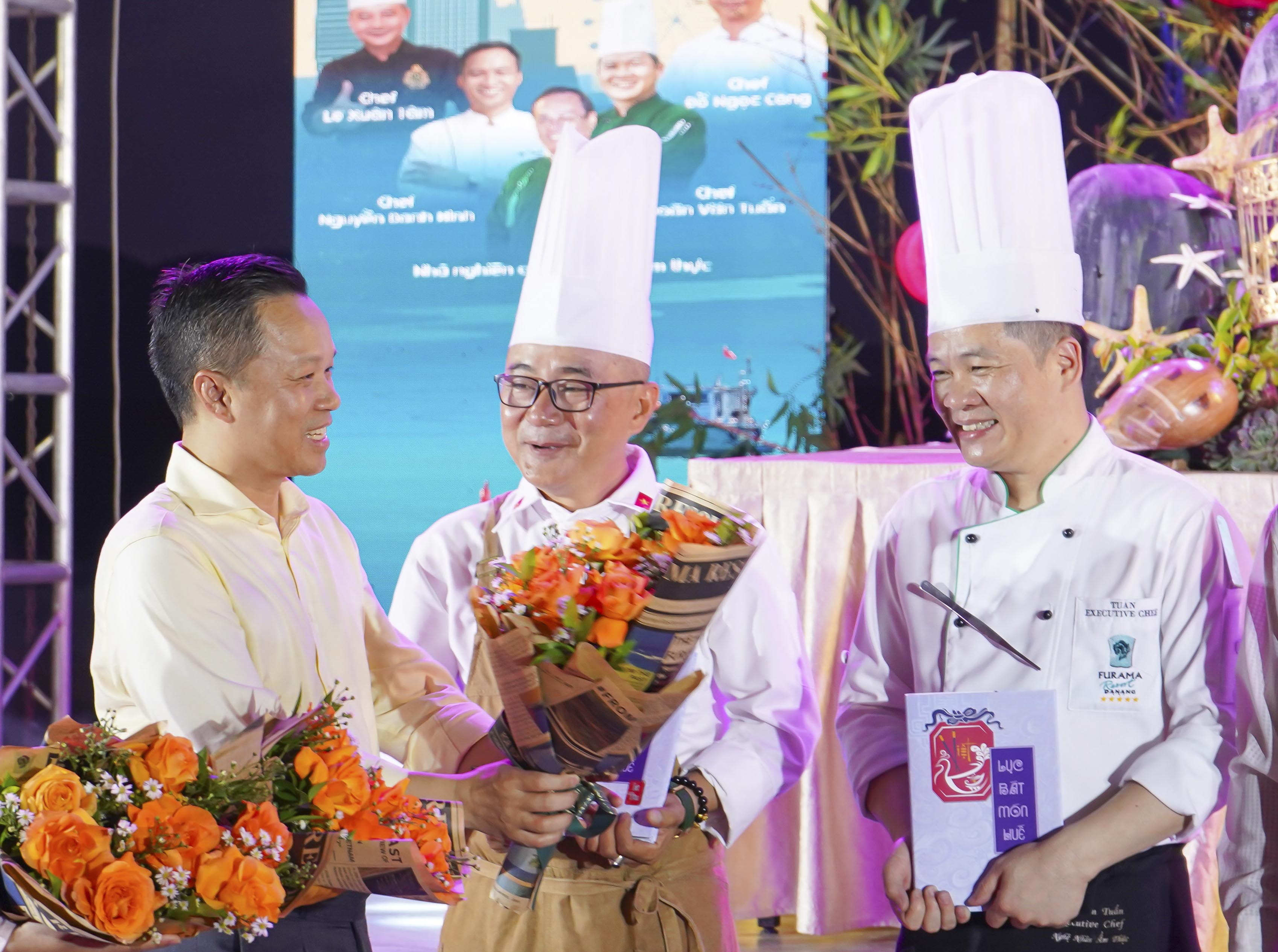 Lãnh đạo Furama Resort Đà Nẵng tặng hoa cho các đầu bếp.