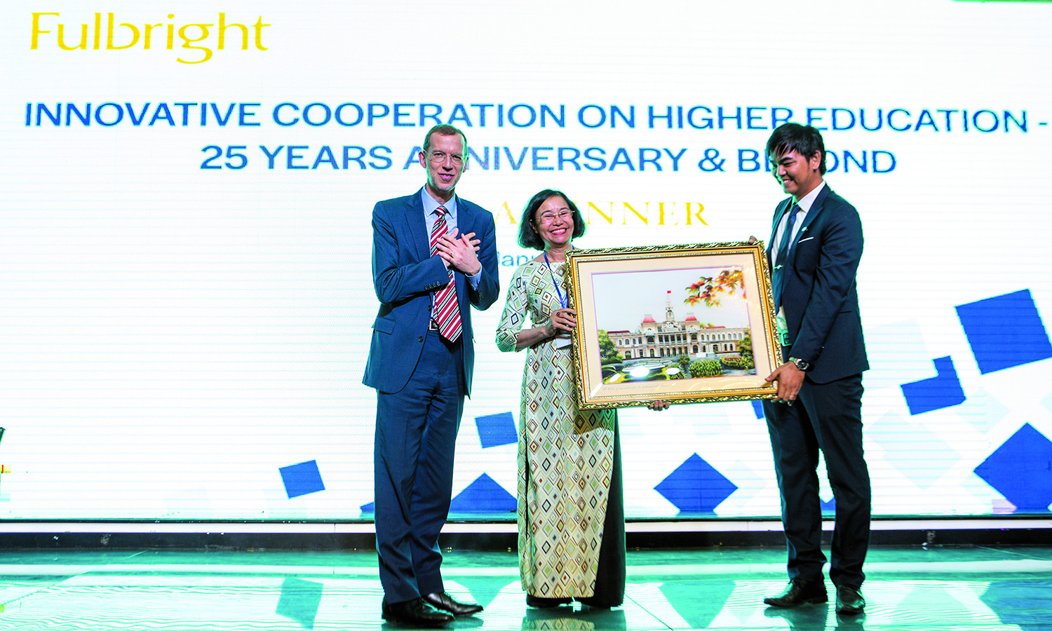 Đại diện cộng đồng hơn 1400 cựu học viên của Fulbright tặng quà kỷ niệm cho Trường Harvard Kennedy trong Lễ kỷ niệm 25 năm ngày ra đời của Chương trình Giảng dạy Kinh tế Fulbright (FETP), tiền thân của Trường Chính sách công và Quản lý Fulbright (FSPPM)