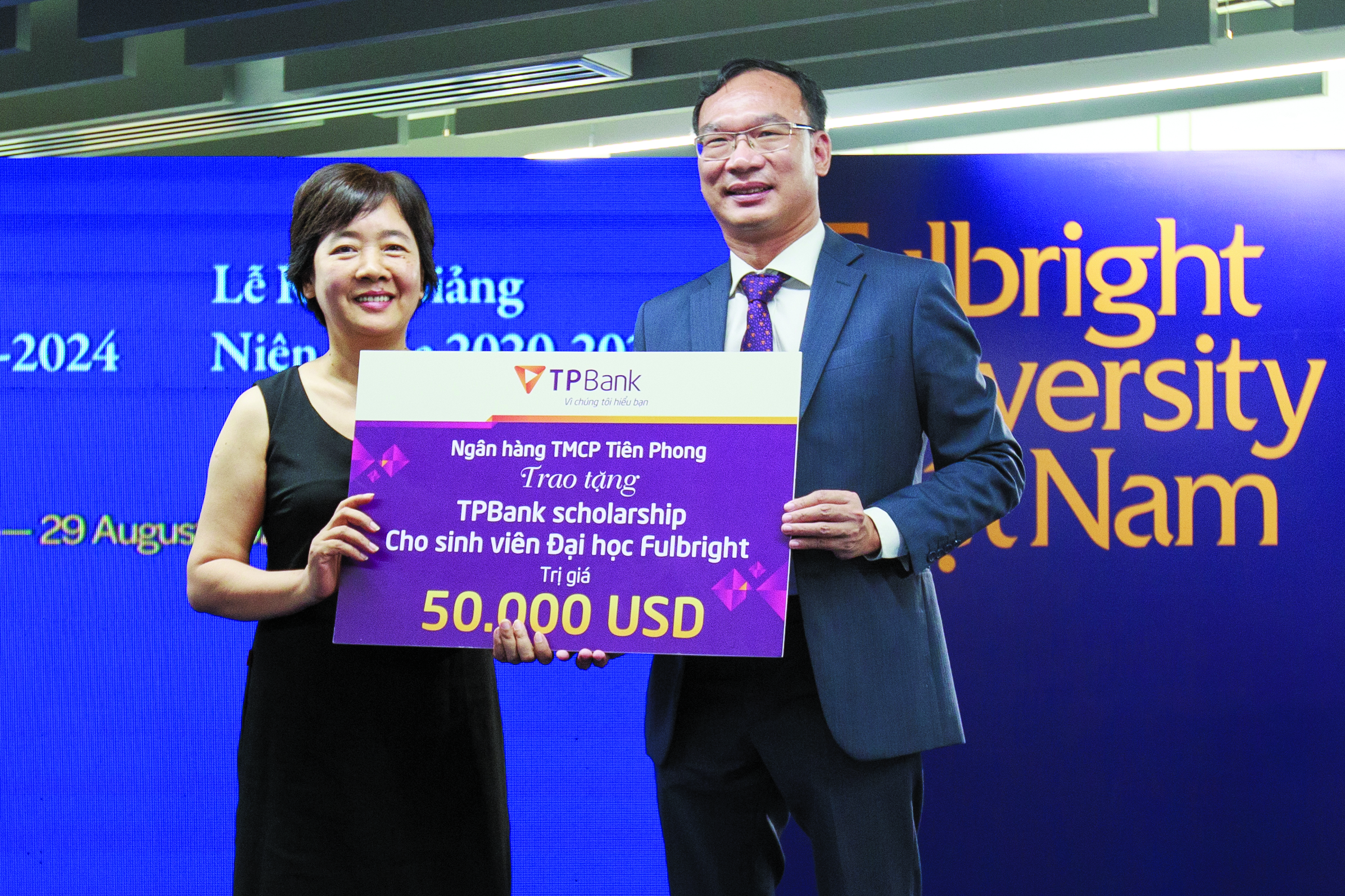 Ông Khúc Văn Họa, Phó Tổng giám đốc TPBank trao tặng học bổngcho trường Fulbright Việt Nam tại lễ khai giảng