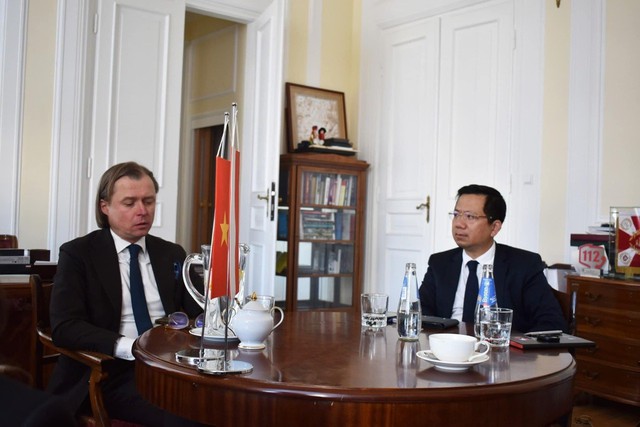 Đại sứ Hà Hoàng Hải làm việc với Chủ tịch tỉnh Mazowieckie Mariusz Frankowski về việc hỗ trợ bà con người Việt bị ảnh hưởng trong vụ cháy Trung tâm thương mại Marywilska. Ảnh: Đại sứ quán Việt Nam tại Ba Lan