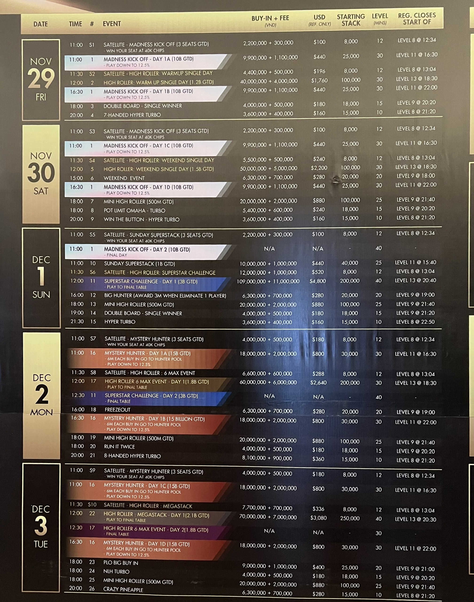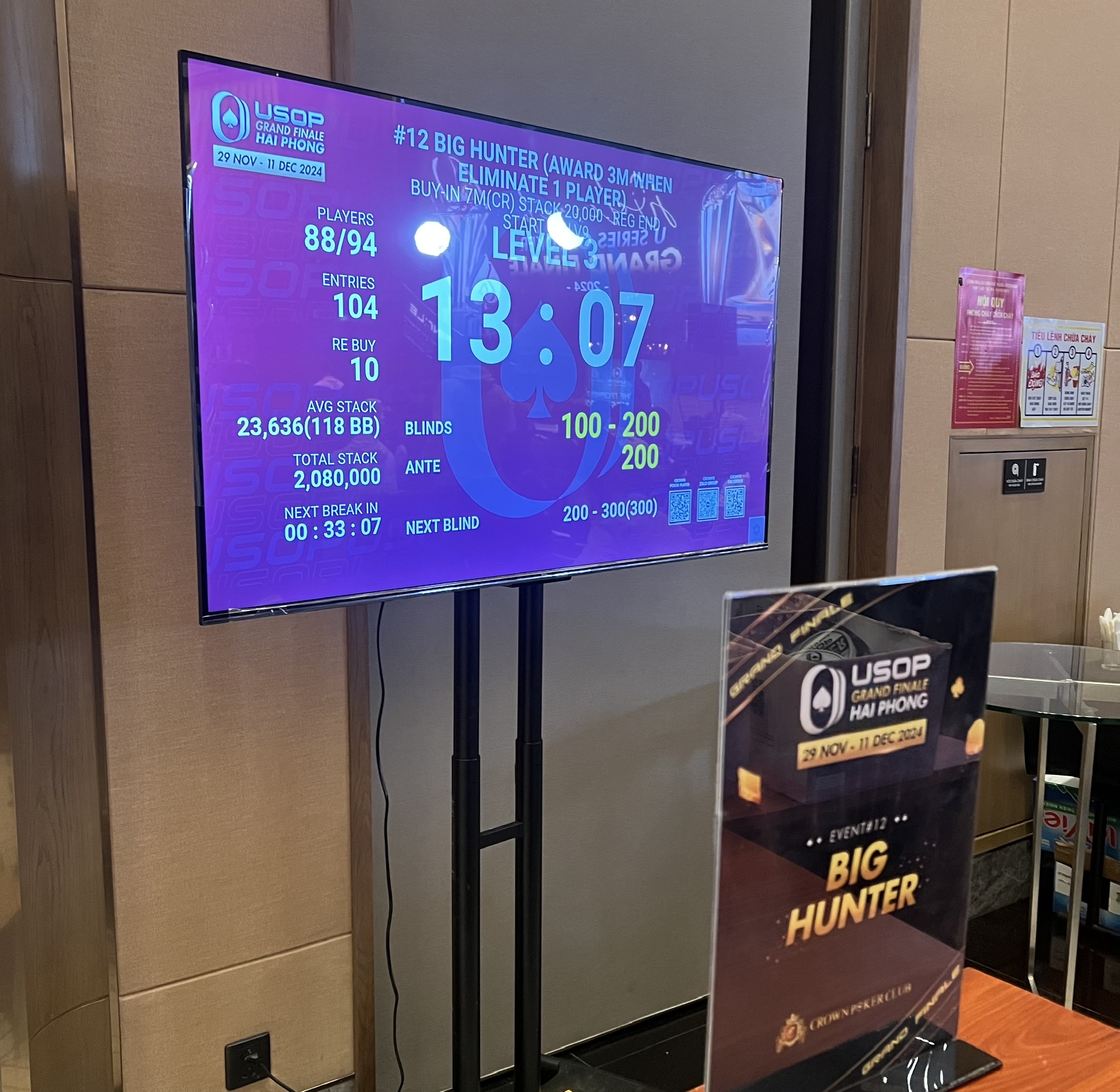 Cụ thể, trong ngày 1/12, giải đấu Poker USOP Hải Phòng có một tour đấu được tổ chức vào lúc 16h với tên gọi là BIG HUNTER. Người chơi tham gia tour này sẽ phải đóng mức phí (Buy In) là 7 triệu đồng. Trong số tiền BUY IN 7 triệu đồng này đã có 3 triệu là phần thưởng khi loại 1 Player (người chơi). Thông tin này được Ban tổ chức ghi rõ ràng trong lịch thi đấu (ảnh dưới đây).