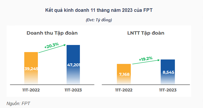 Về kết quả kinh doanh, trong tháng 11/2023, doanh thu của FPT đạt hơn 4.700 đồng và lợi nhuận trước thuế gần 860 tỷ đồng.