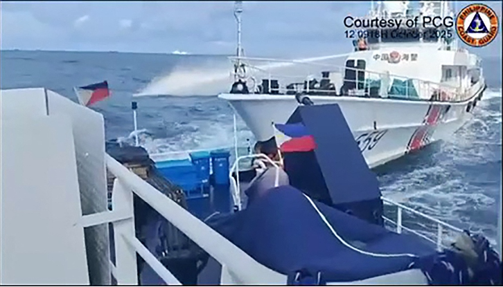 Hình ảnh trích từ video do Lực lượng Tuần duyên Philippines ghi lại và công bố vào ngày 12-10 cho thấy một tàu của Hải cảnh Trung Quốc (phải) đang sử dụng vòi rồng ở gần đảo Thị Tứ - Ảnh: AFP