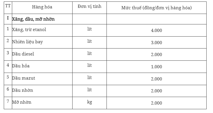 Theo quy định tại Mục I khoản 1 Điều 1 của Nghị quyết số 579/2018/UBTVQH14, mức thuế bảo vệ môi trường đối với xăng, dầu, mỡ nhờn được quy định như sau: