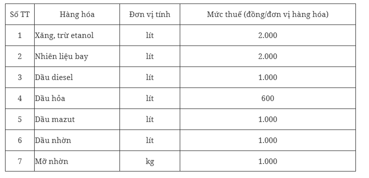 Cụ thể, mức thuế bảo vệ môi trường đối với xăng, dầu, mỡ nhờn từ ngày 01/01/2026 đến hết ngày 31/12/2026 được đề xuất như sau:
