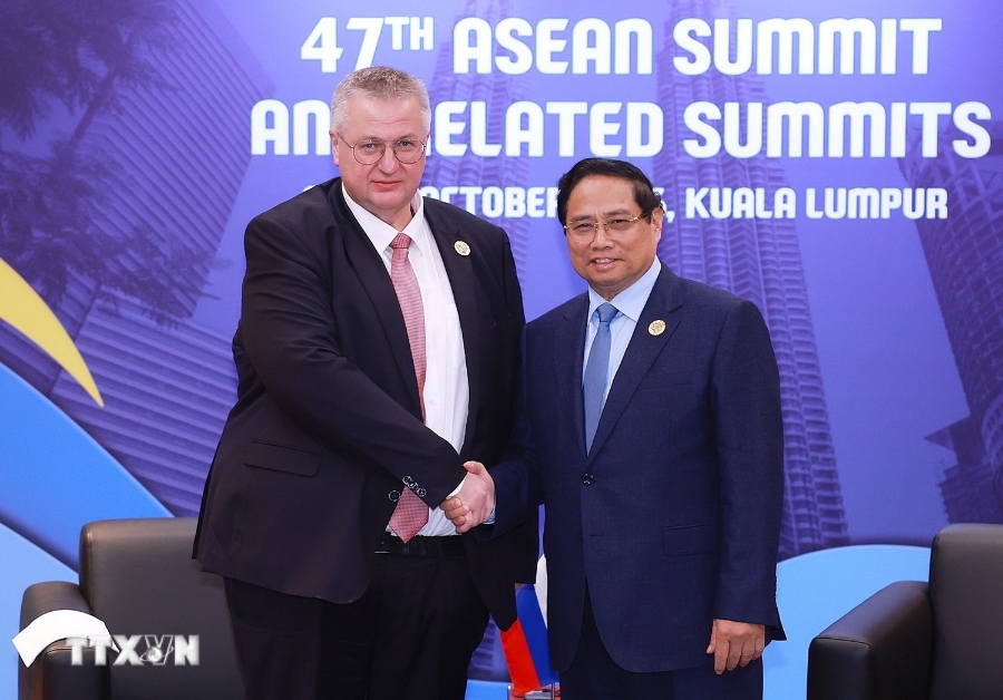 Thủ tướng Phạm Minh Chính đã có cuộc gặp và trao đổi với Phó Thủ tướng Nga Alexey Overchuk. (Ảnh: TTXVN)
