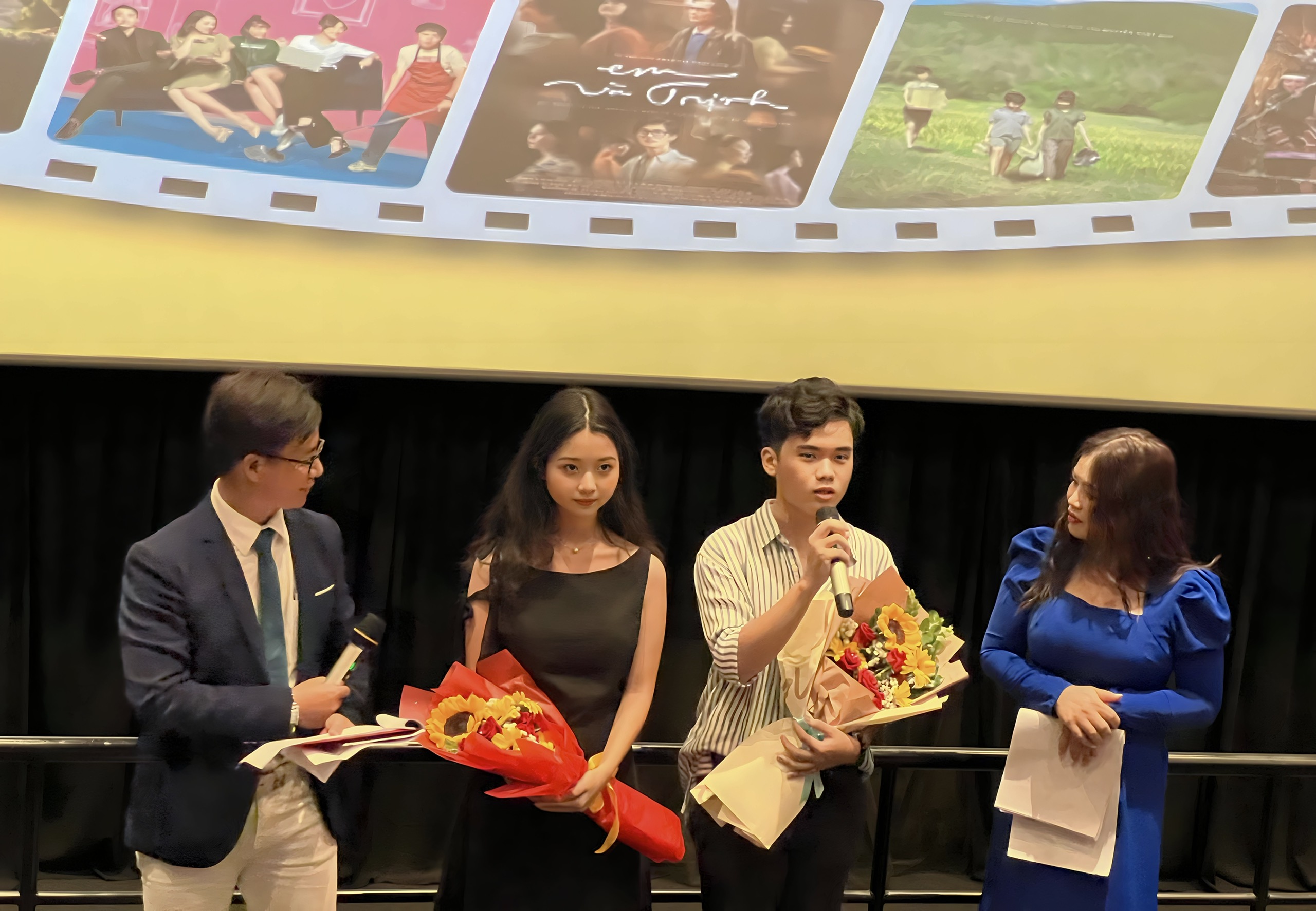 Diễn viên phim Tôi thấy hoa vàng trên cỏ xanh: Lâm Thanh Mỹ (thứ hai, bên trái) và Trọng Khang (thứ hai, bên phải) giao lưu với khán giả. Nguồn: PYO