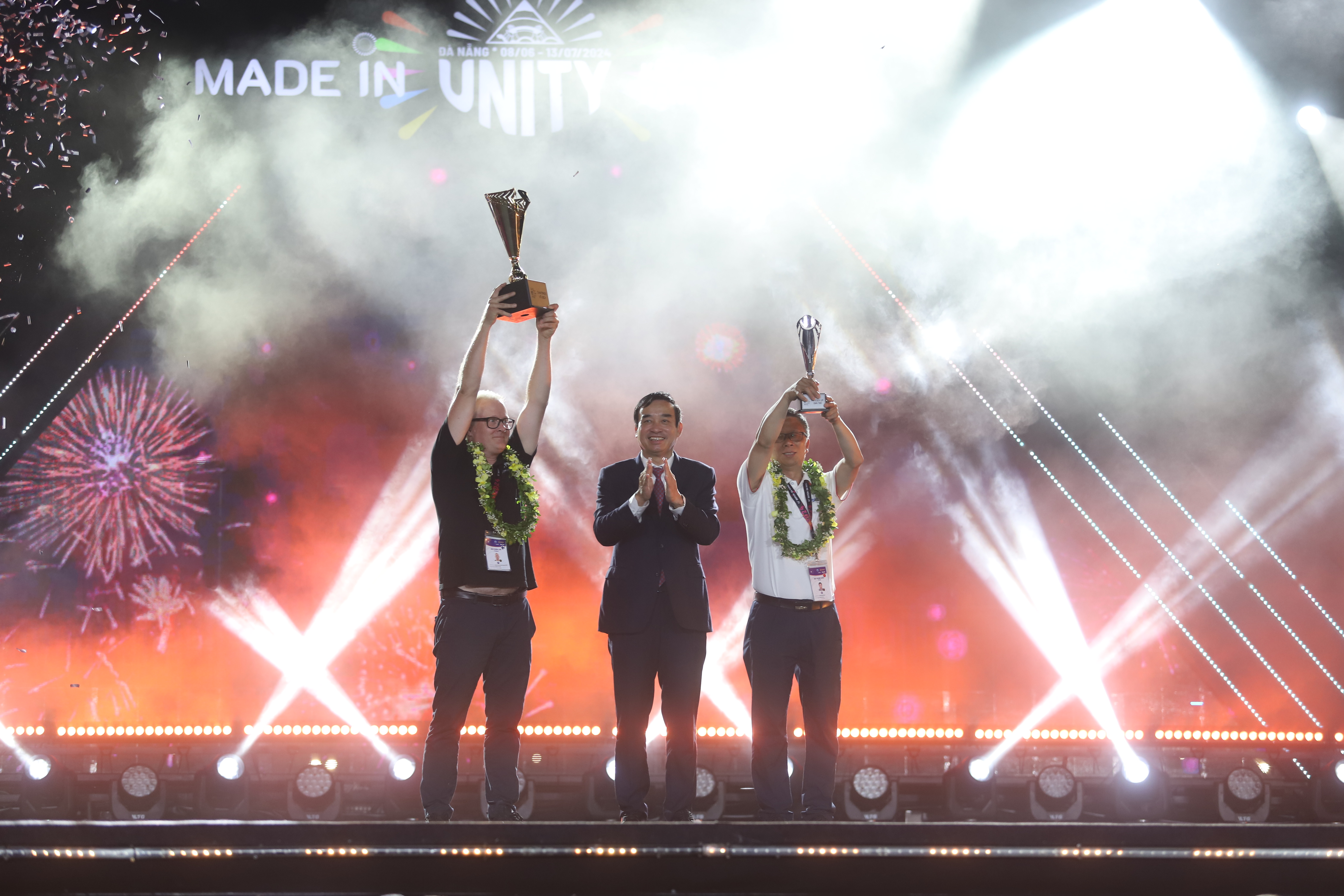 Ông Lê Trung Chinh, Chủ tịch UBND thành phố Đà Nẵng trao giải Quán quân cho đội Phần Lan (bên trái) và giải Á quân cho đội pháo hoa đến từ Trung Quốc (bên phải).