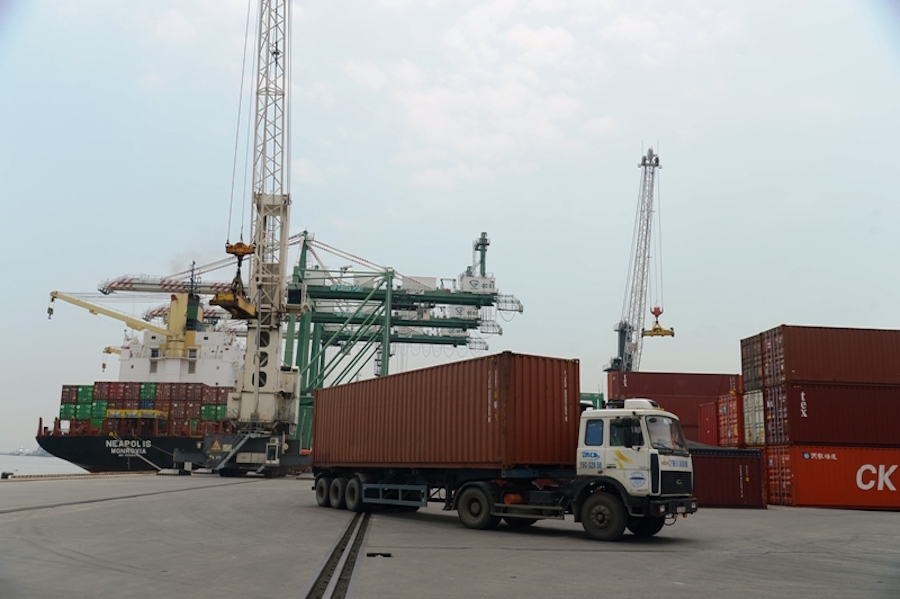 Hoạt động bốc xếp hàng xuất khẩu tại cảng Đình Vũ, TP Hải Phòng. Ảnh: Phạm Hùng