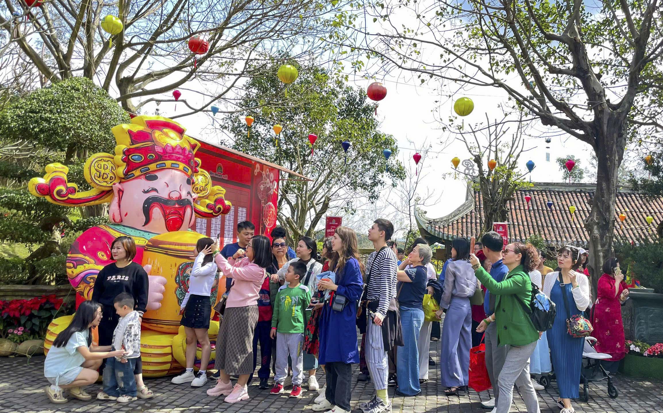 Du khách hào hứng chụp ảnh với Ông Thần Tài và check-in cùng 12 con giáp.