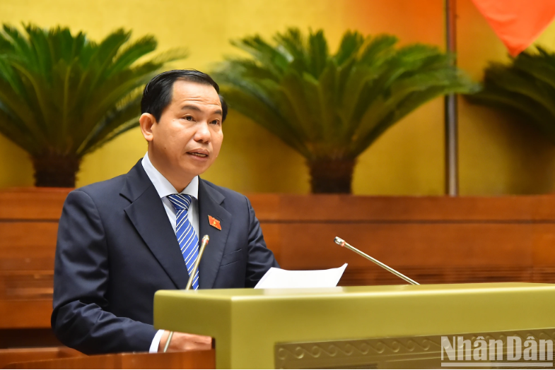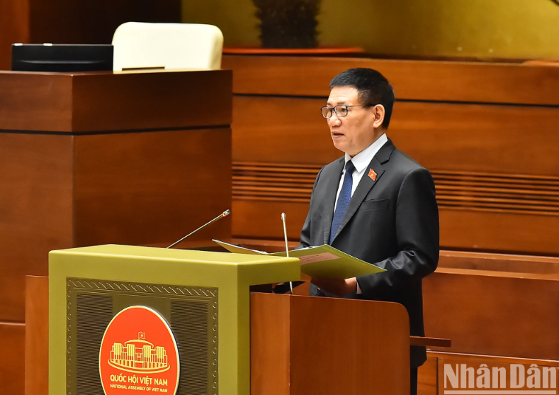 Bộ trưởng Tài chính Hồ Đức Phớc, thừa ủy quyền của Thủ tướng Chính phủ, trình bày Tờ trình dự thảo Nghị quyết về việc áp dụng thuế thu nhập doanh nghiệp bổ sung theo quy định chống xói mòn cơ sở thuế toàn cầu. (Ảnh: THỦY NGUYÊN)