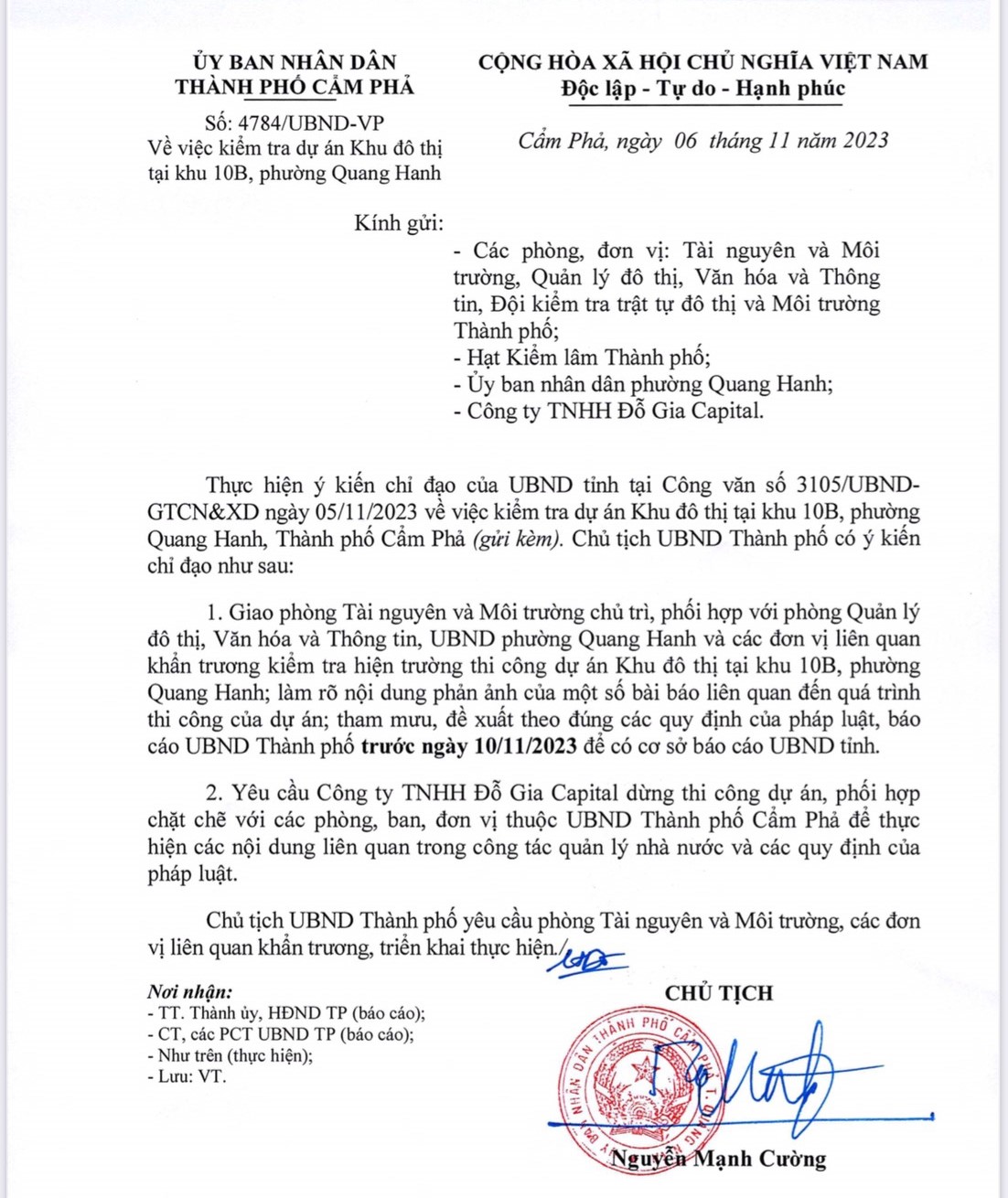 Văn bản chỉ đạo của UBND TP. Cẩm Phả về việc kiểm tra dự án Khu đô thị tại khu 10B phường Quang Hanh.