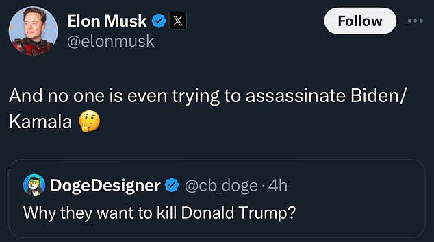 Tỷ phú giàu nhất thế giới, Elon Musk, gần đây đã gây ra tranh cãi lớn khi đăng một bình luận trên mạng xã hội X (Twitter), liên quan đến vụ ám sát hụt cựu Tổng thống Mỹ Donald Trump. Trong bài viết, Musk đã đặt câu hỏi: "Vì sao họ lại muốn sát hại Donald Trump? Và không có ai thậm chí cố gắng ám sát ông Biden hay bà Kamala," ám chỉ Tổng thống Joe Biden và Phó Tổng thống Kamala Harris.