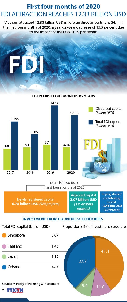 V.U.M - Vietnam attracted 12.33 billion USD in foreign direct investment (FDI) in the first four months of 2020, a year-on-year decrease of 15.5 percent due to the impact of the COVID-19 pandemic, according the Ministry of Planning and Investment’s Foreign Investment Agency (FIA).