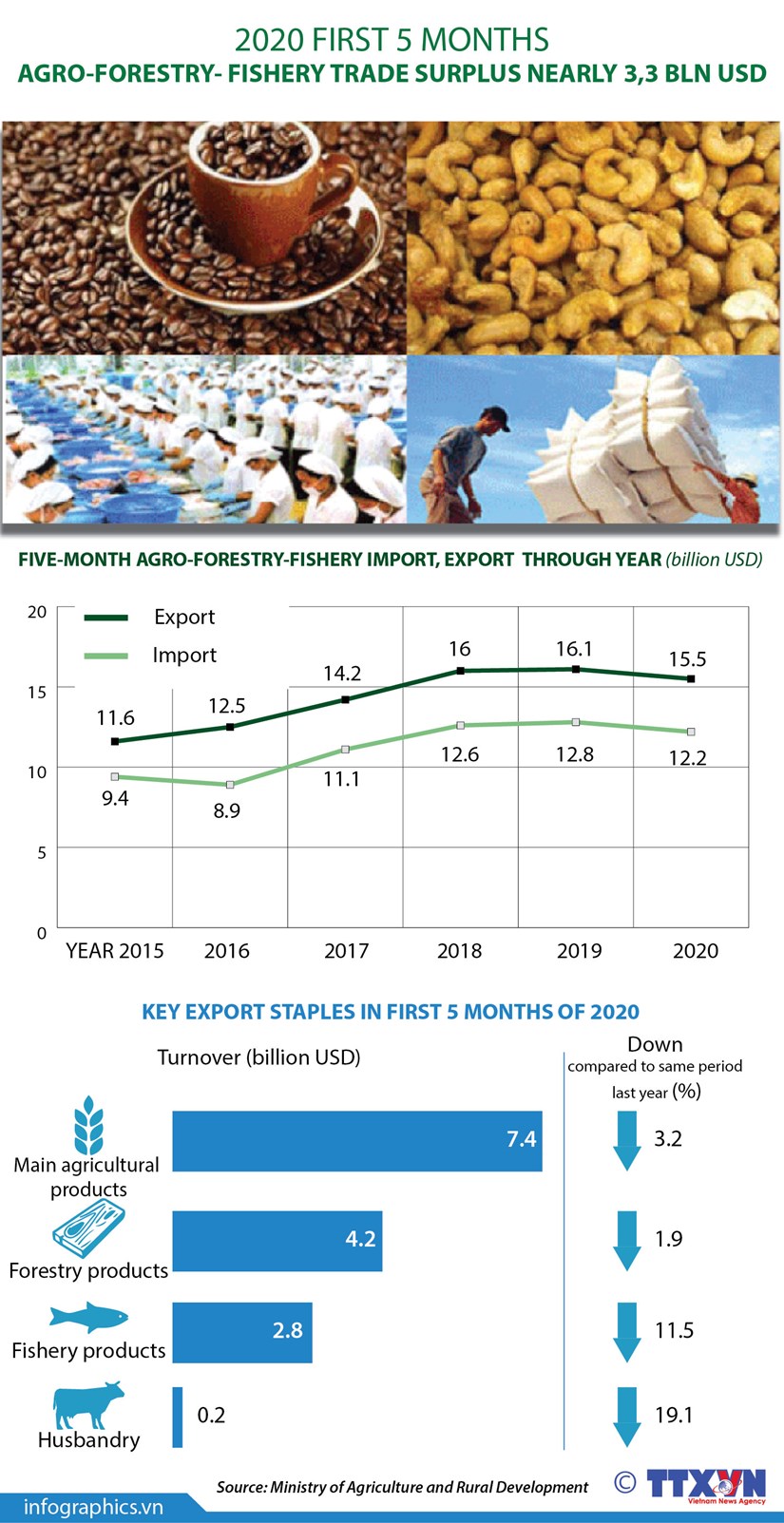 V.U.M - The agro-forestry-fishery sector recorded a trade surplus of close to 3.3 billion USD in the first five months of 2020, a decline of a mere 2.3 percent year-on-year.