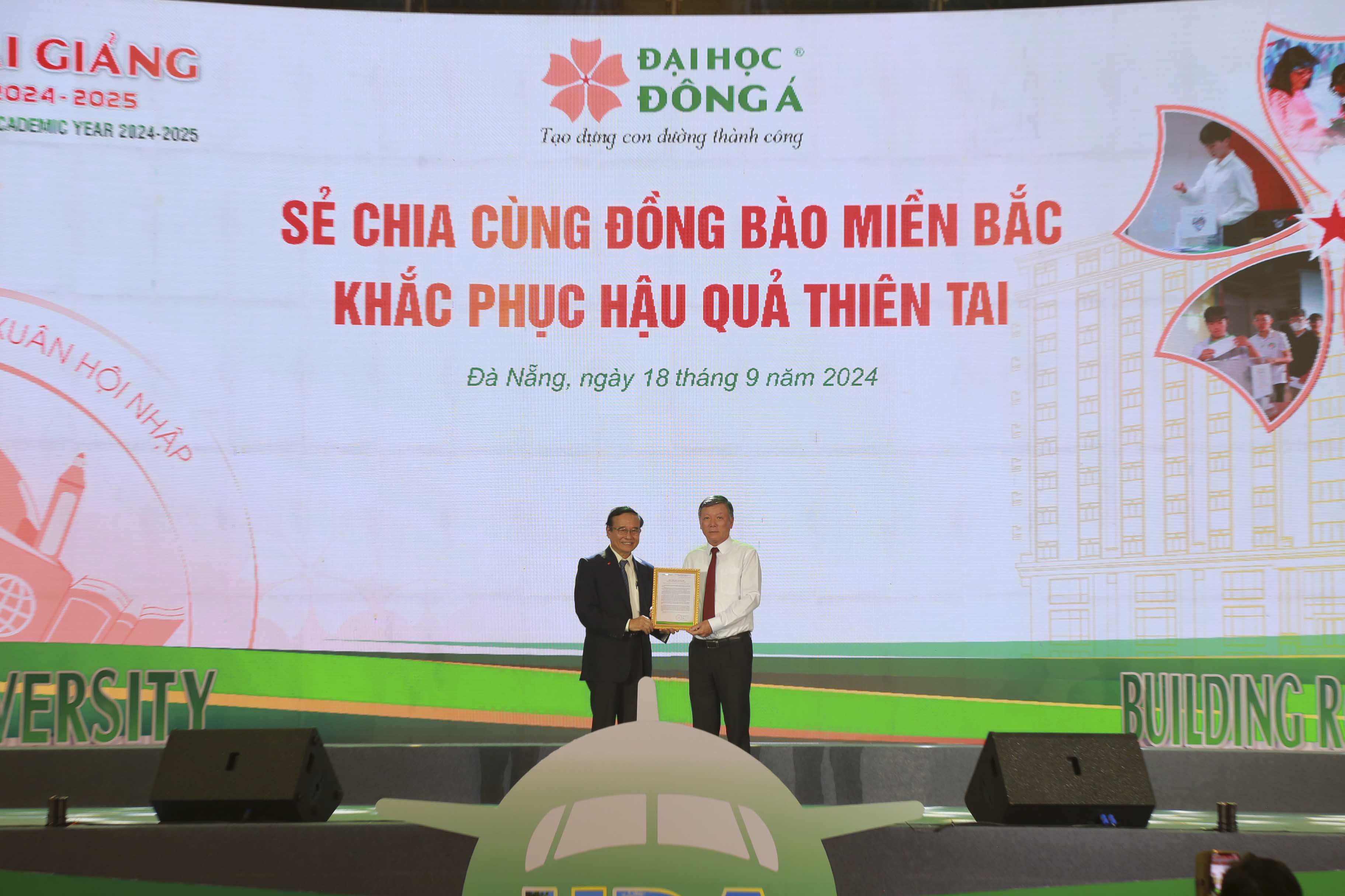 Tại chương trình, Đại học Đông Á cũng dành san sẻ cùng đồng bào các tỉnh, thành miền Bắc khắc phục hậu quả bão số 3 (Yagi) với số tiền 500 triệu đồng được trao gửi thông qua Uỷ ban MTTQ Việt Nam TP. Đà Nẵng. Đây là phần đóng góp từ mỗi thầy cô và CBNV một ngày lương, mỗi sinh viên 1 ly cà phê sáng; từ việc gác lại các chương trình tài năng nghệ thuật của sinh viên và đêm hội Trung thu của con em cán bộ, giảng viên nhà trường.