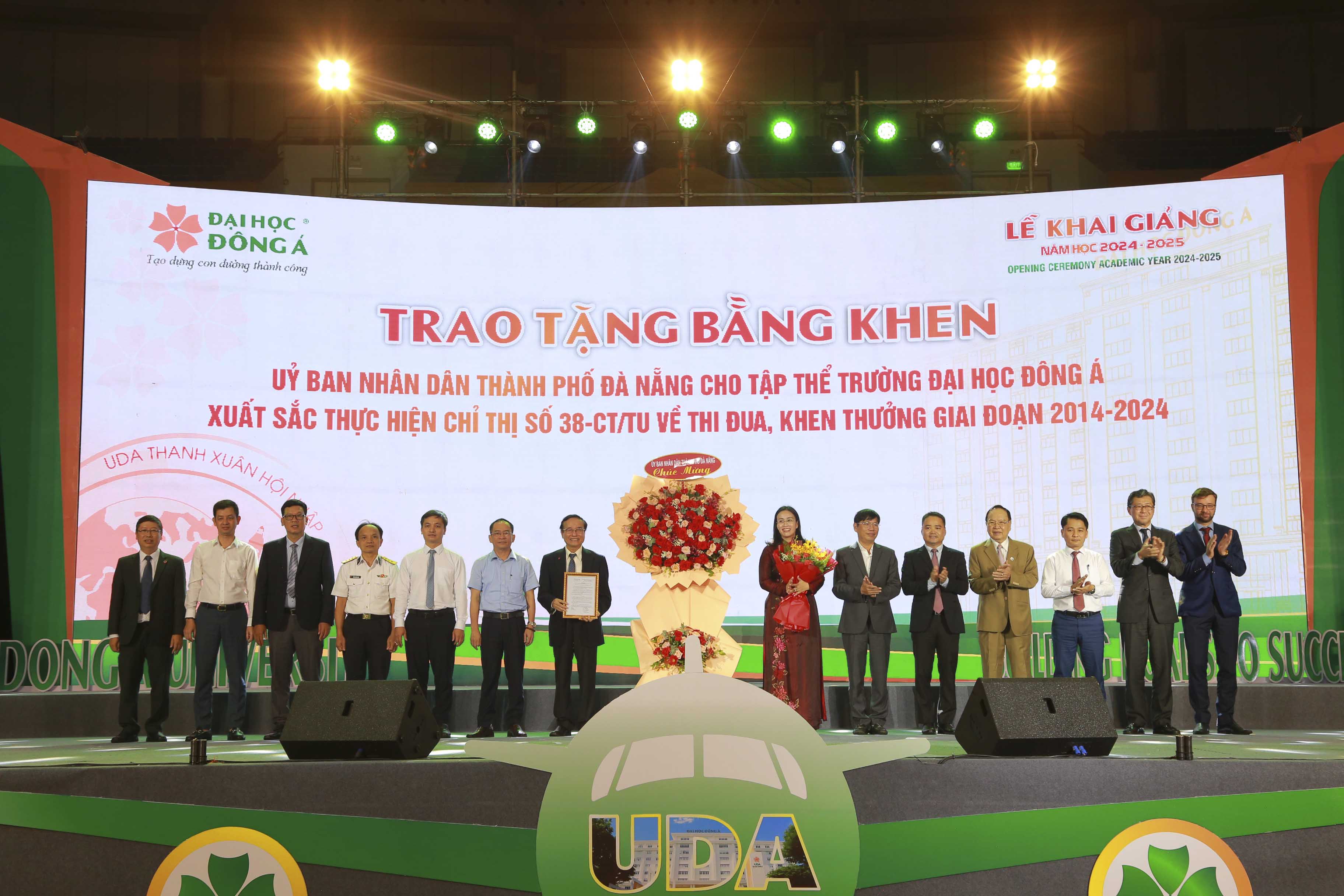 Phó Chủ tịch UBND TP. Đà Nẵng Nguyễn Thị Anh Thi trao tặng Bằng khen của Chủ tịch UBND TP. Đà Nẵng dành cho tập thể đã có thành tích xuất sắc trong 10 năm thực hiện Chỉ thị số 38-CT/TU ngày 5/9/2014 của Ban Thường vụ Thành uỷ về tiếp tục đổi mới công tác thi đua, khen thưởng, giai đoạn 2014-2024 cho BGH Đại học Đông Á.