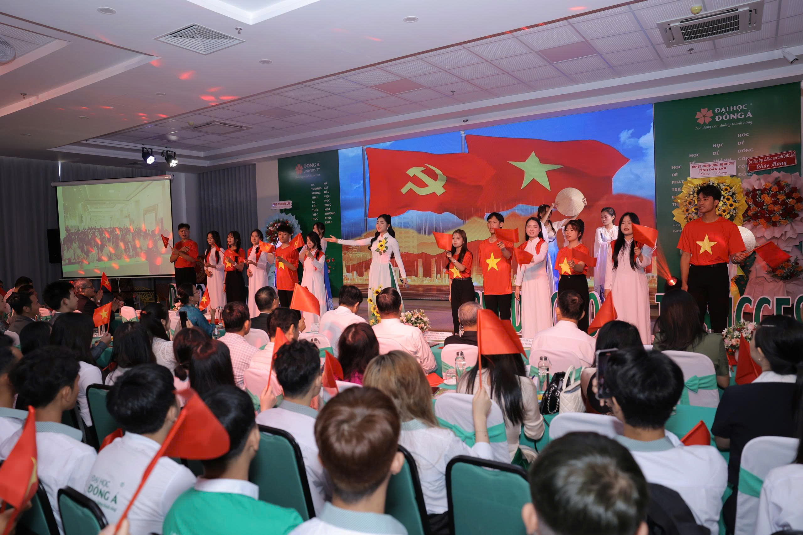 Chào tân sinh viên 2025 Đại học Đông Á phân hiệu Đắk Lắk còn là ấn tượng và hứng khởi với sự góp mặt của nữ ca sĩ Duyên Quỳnh - người con của quê hương Đắk Lắk, trong ca khúc “Viết tiếp câu chuyện hoà bình” hoà giọng cùng các bạn sinh viên Đại học Đông Á phân hiệu Đắk Lắk, nghi thức rước cờ truyền thống trong không gian học tập sáng tạo, hội nhập.