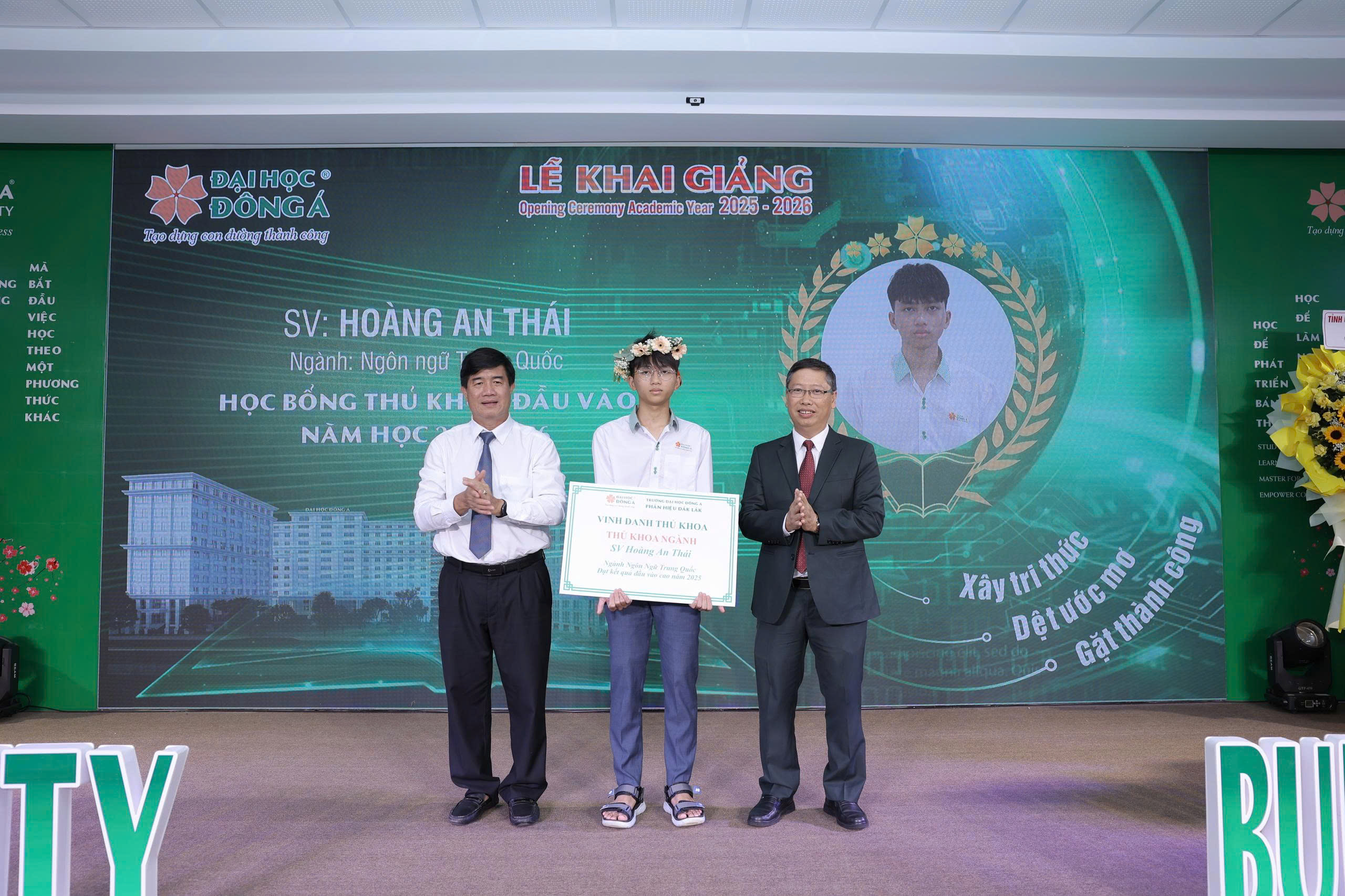 Đón nhận suất học bổng toàn phần trị giá 100% học phí toàn khoá học, tân sinh viên Hoàng An Thái - ngành Ngôn Ngữ và Văn hóa Trung Quốc xúc động chia sẻ: "Suất học bổng toàn phần từ Đại học Đông Á mang đến cho em sự vinh dự và thật nhiều cảm xúc. Đây không chỉ là món quà hỗ trợ về mặt tài chính, mà còn là sự công nhận cho những nỗ lực học tập của em trong thời gian qua và chính là sự động viên lớn lao cho hành trình chinh phục ngành học Ngôn ngữ Trung mà em theo đuổi.” Được biết, Hoàng An Thái là thủ khoa đầu vào năm 2025 với kết quả thi TN THPT đạt 28,58 điểm.