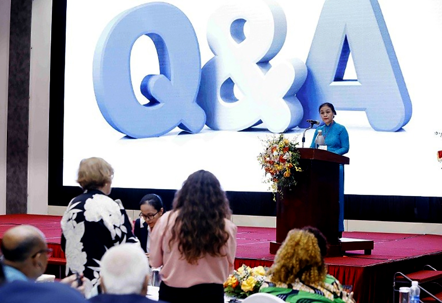 Tại cuộc trao đổi, các đại biểu đã đặt ra nhiều câu hỏi về tình hình phát triển kinh tế - xã hội, vấn đề phổ cập giáo dục, bảo vệ môi trường, bình đẳng giới, chính sách ngoại giao của Việt Nam... và được giải đáp trên tinh thần cởi mở, tin cậy. Chủ tịch Nguyễn Phương Nga đã lắng nghe những trao đổi và trả lời các câu hỏi của các đại biểu đến từ nhiều nước.