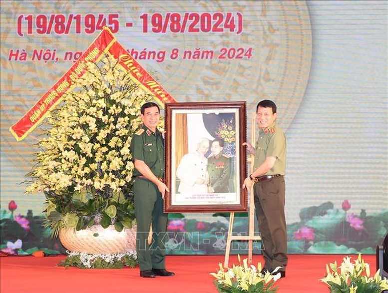 Thượng tướng, Bộ trưởng Công an Lương Tam Quang, thay mặt Đảng ủy Công an Trung ương, Bộ Công an trao tặng bức ảnh "Bác Hồ và Đại tướng Võ Nguyên Giáp" cho Đại tướng, Bộ trưởng Quốc phòng Phan Văn Giang thay mặt Quân ủy Trung ương, Bộ Quốc phòng. Ảnh: Trí Dũng/TTXVN