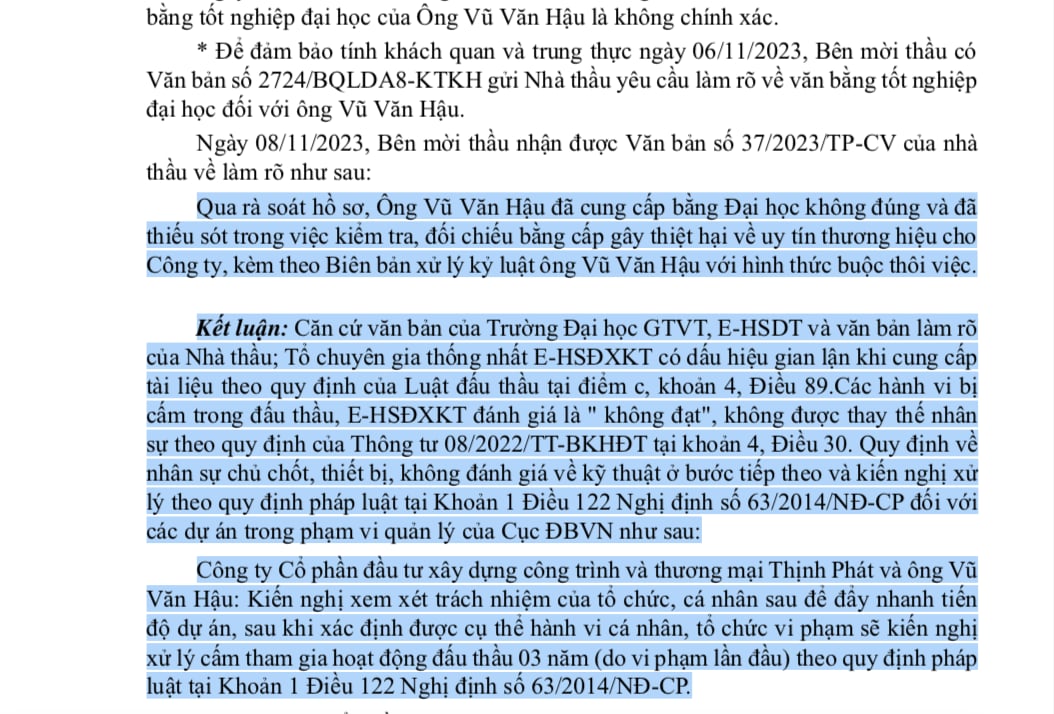 Trước đó, tại báo cáo đánh giá E-HSĐXKT của Tổ chuyên gia đấu thầu (Ban Quản lý dự án 8 – bên mời thầu), về nhân sự chủ chốt (Chỉ huy trưởng) - trong quá trình đánh giá E-HSĐXKT của nhà thầu, bên mời thầu có nghi vấn một số nội dung nhà thầu kê khai và cung cấp tài liệu không trung thực về văn bằng tốt nghiệp đại học đối với vị trí chỉ huy trưởng công trình là ông Vũ Văn Hậu và đã có Văn bản số 2560/BQLDA8-KTKH ngày 25/10/2023 gửi Trường Đại học Giao thông vận tải để xác nhận về thông tin nêu trên.