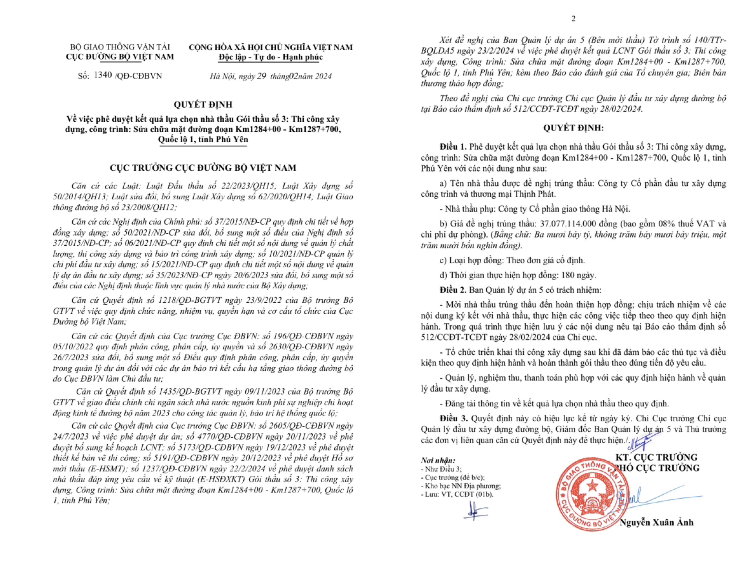 Tiếp đó, ngày 29/2/2024, ông Nguyễn Xuân Ảnh, Phó Cục trưởng Cục Đường bộ Việt Nam cũng ký quyết định phê duyệt kết quả lựa chọn nhà thầu Gói thầu số 3: Thi công xây dựng, công trình: Sửa chữa mặt đường đoạn Km1284+00 - Km1287+700, Quốc lộ 1, tỉnh Phú Yên. Liên danh nhà thầu trúng thầu là Công ty Thịnh Phát - Công ty Cổ phần giao thông Hà Nội, với giá trúng thầu hơn 37,07 tỷ đồng; giá dự toán gói thầu hơn 37,20 tỷ đồng.