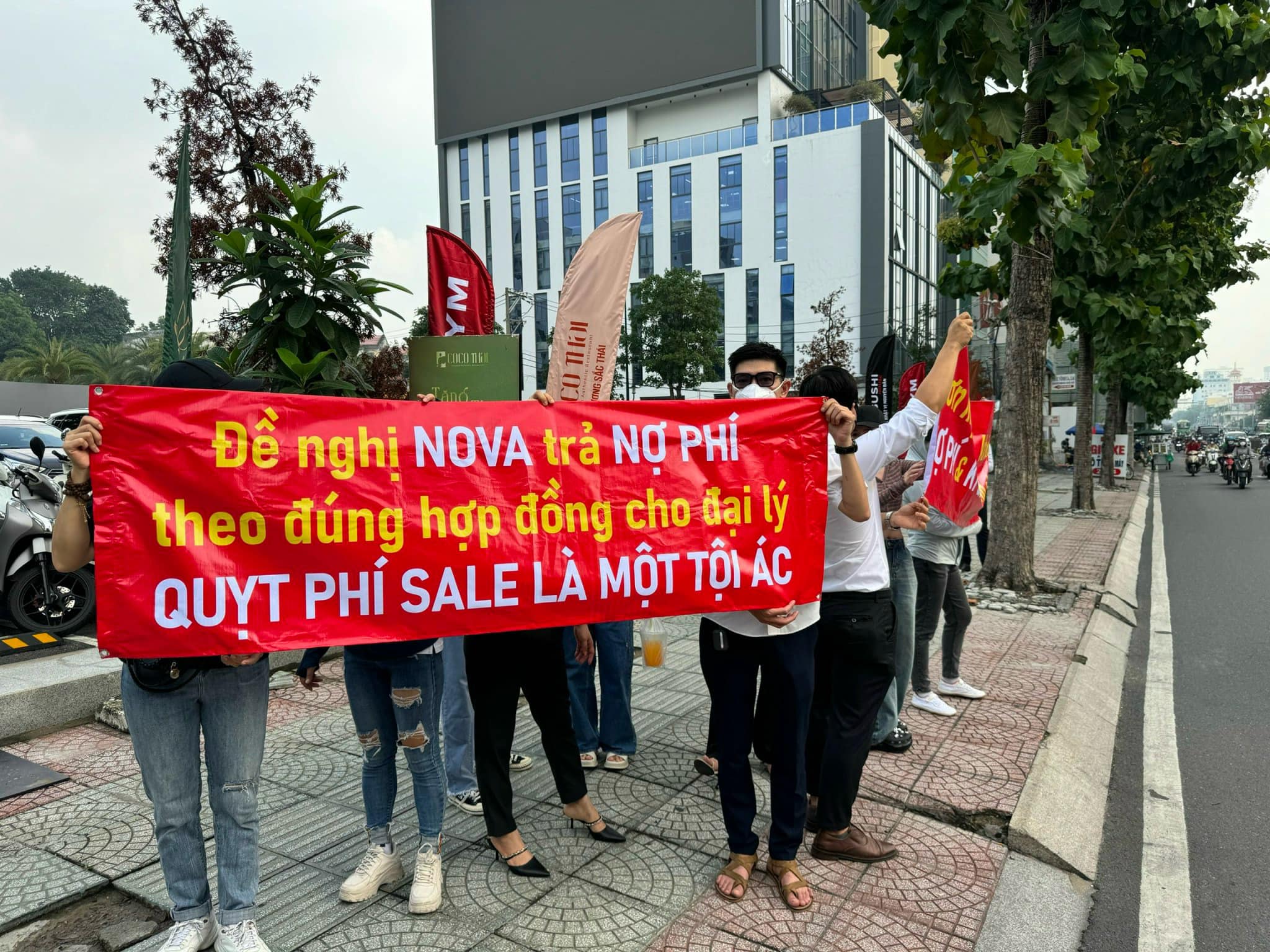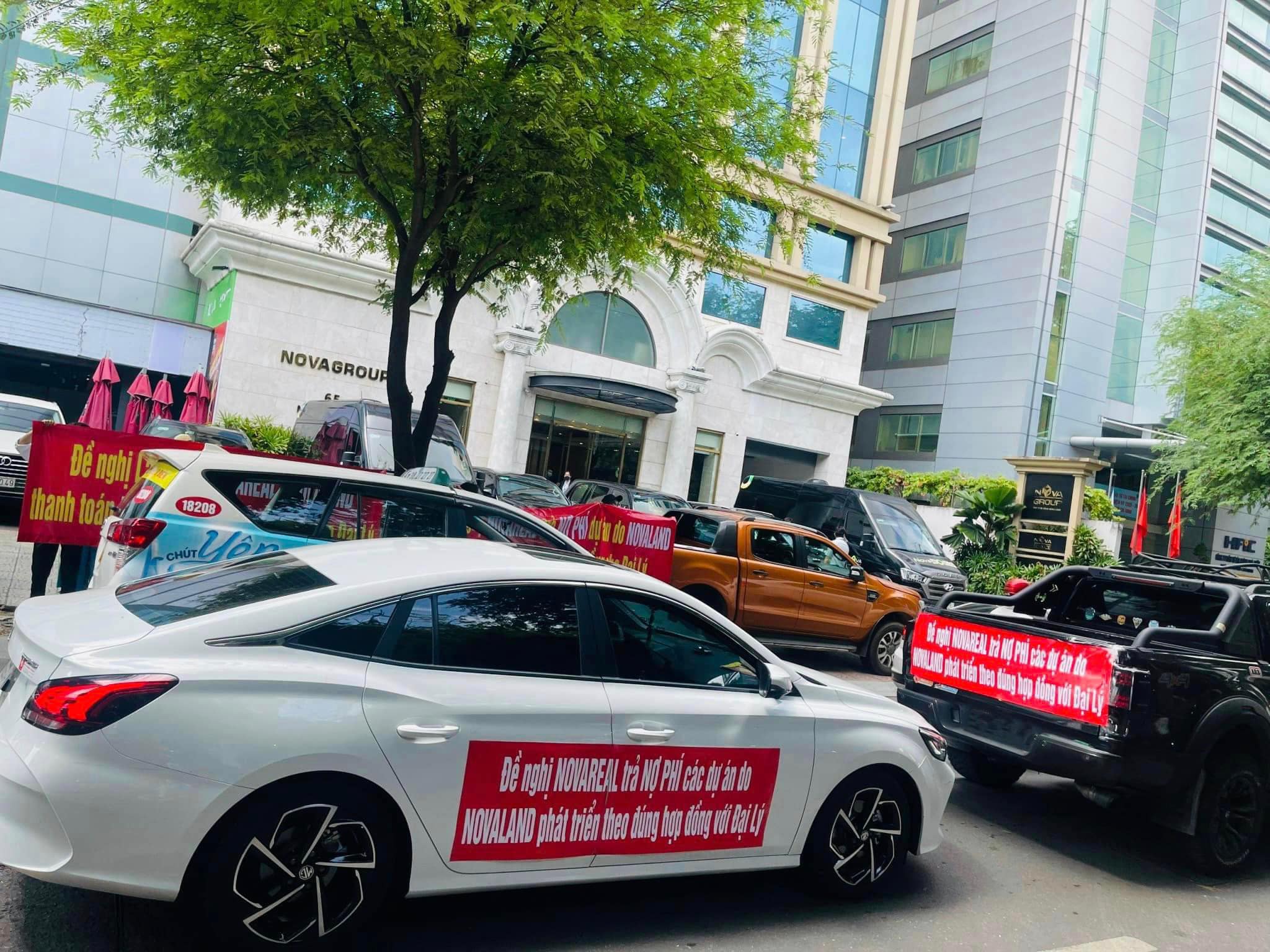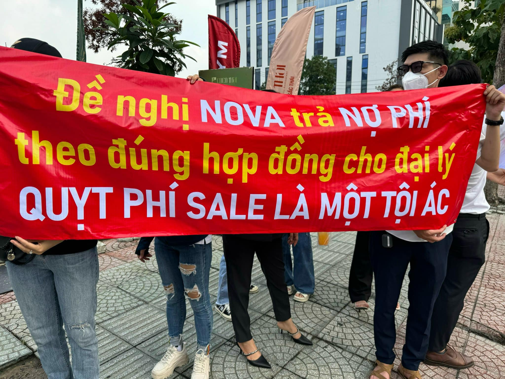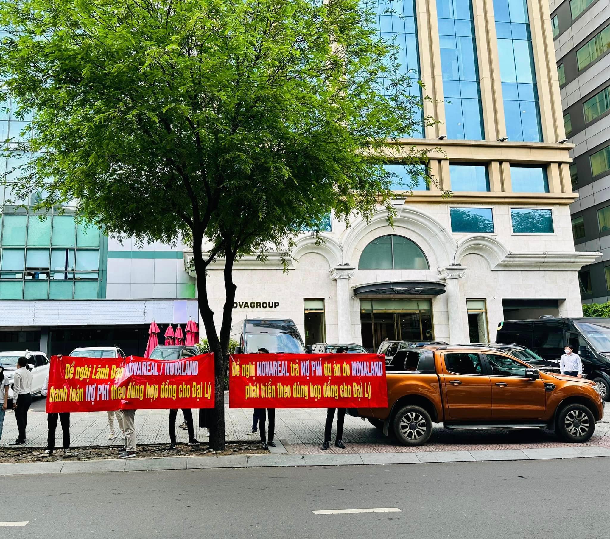 Nhiều đại lý căng băng rôn trước trụ sở Tập đoàn Novaland (Ảnh: Nhân vật cung cấp)