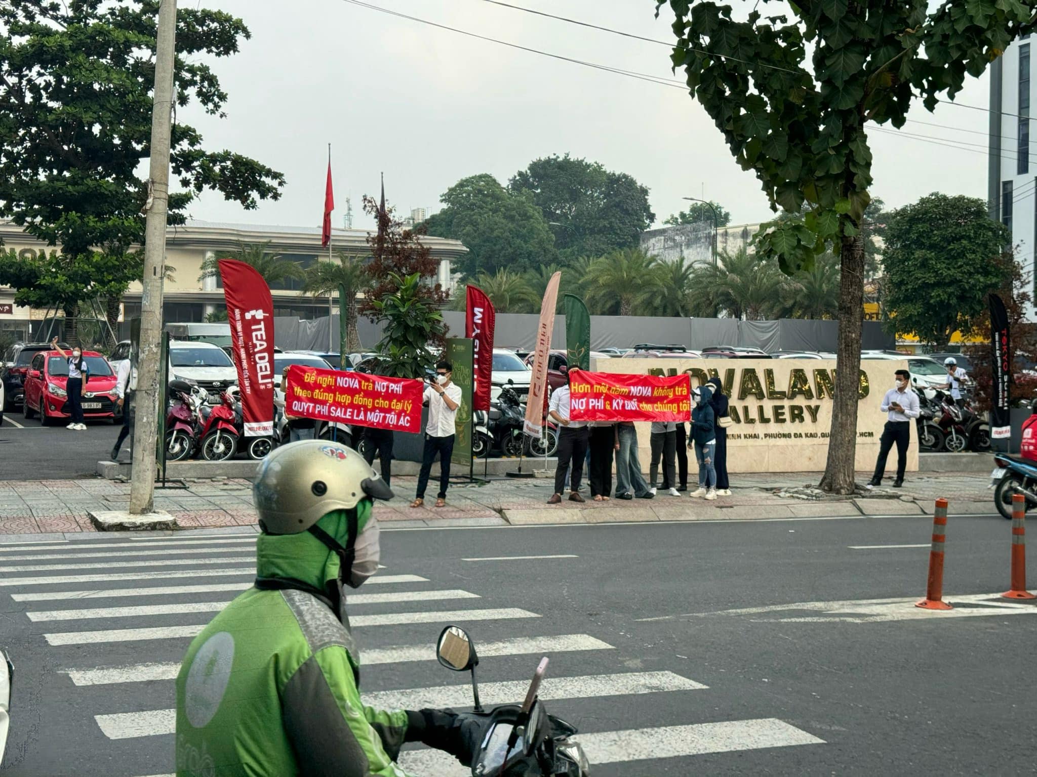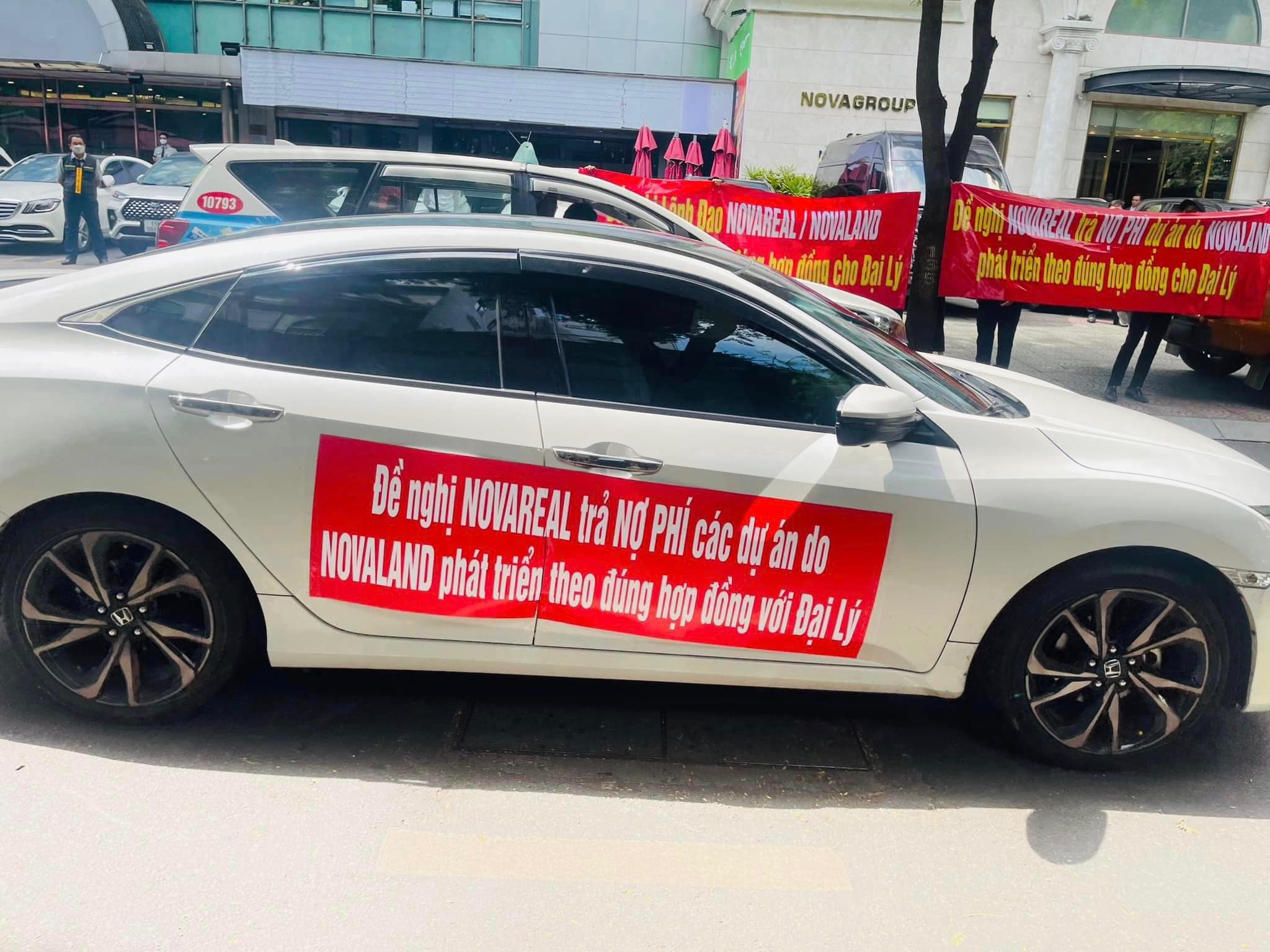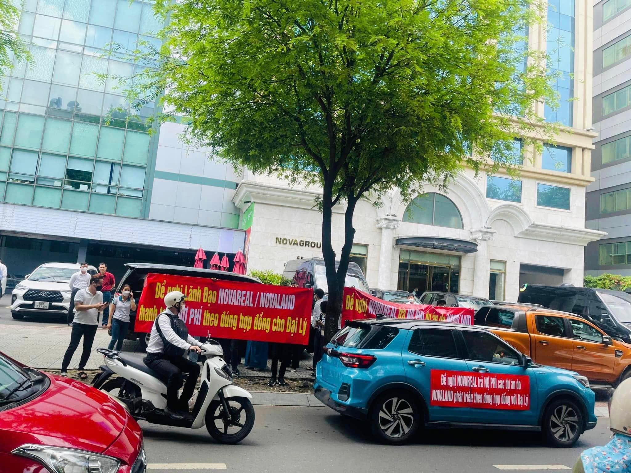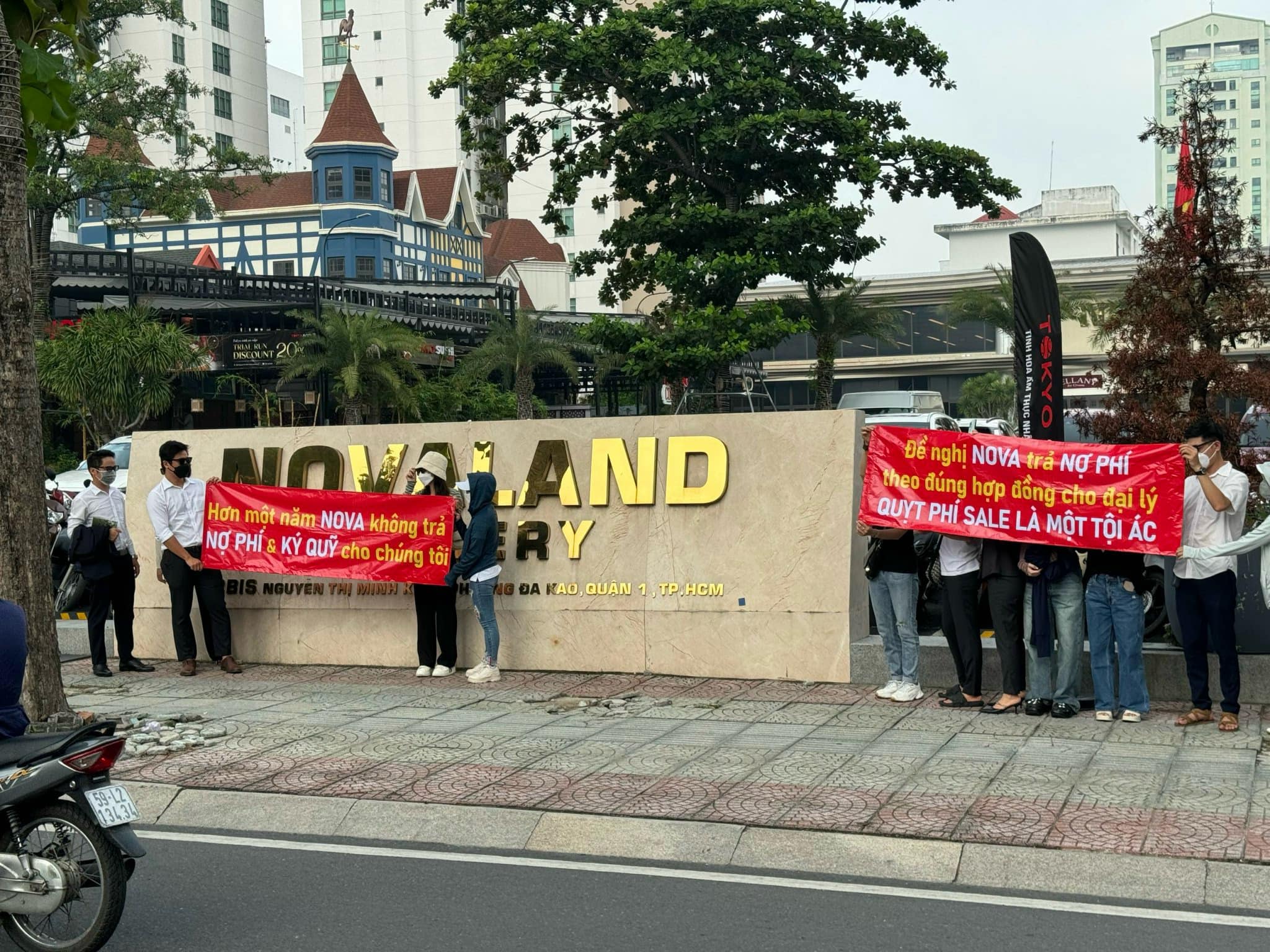 Nhiều đại lý căng băng rôn trước trụ sở Tập đoàn Novaland (Ảnh: Nhân vật cung cấp)