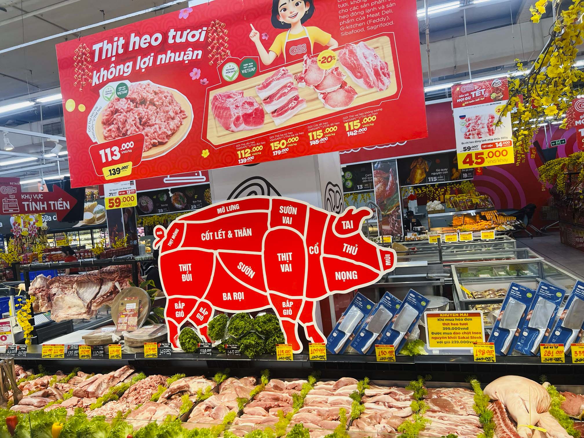 Đặc biệt, trong dịp này, tại hệ thống siêu thị GO! còn thực hiện thêm các chương trình hoạt náo hấp dẫn, như: Đập heo đất trúng thưởng, pha lóc, sampling, minigame; áp dụng khuyến mãi hấp dẫn: bộ 2 thớt gỗ chỉ 99.000 đồng (giá thường 109.000 đồng/bộ) khi mua từ 199.000 thịt heo tươi; dao chặt độc quyền từ GO! và Tops Market giá chỉ 239.000 đồng (giá thường 389.000 đồng/chiếc) khi mua từ từ 399.000 đồng thịt heo tươi,…
