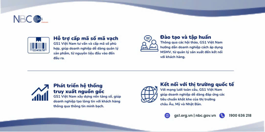 - GS1 Việt Nam không ngừng cập nhật các công nghệ mới như blockchain, mã QR thông minh, giúp doanh nghiệp chuyển đổi số và tăng khả năng cạnh tranh trong kỷ nguyên 4.0.