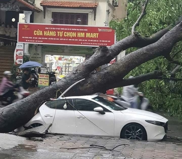 Gió lớn khiến cây đổ đè lên nhiều ô tô ở Hà Nội