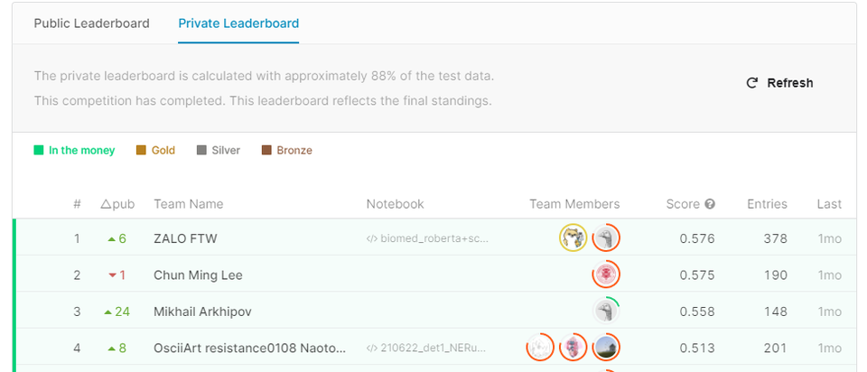 Thành tích của đội thi Zalo trên bảng thành tích của Kaggle. Ảnh chụp màn hình.