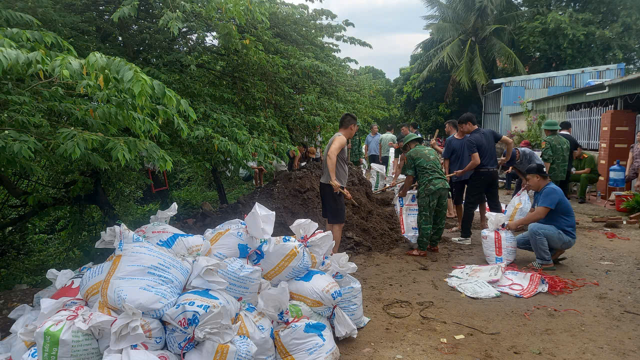 Bộ đội biên phòng huyện Cát Hải đóng bao tải đất, cát hỗ trợ người dân gia cố nhà cửa, che chắn các khu vực xung yếu.