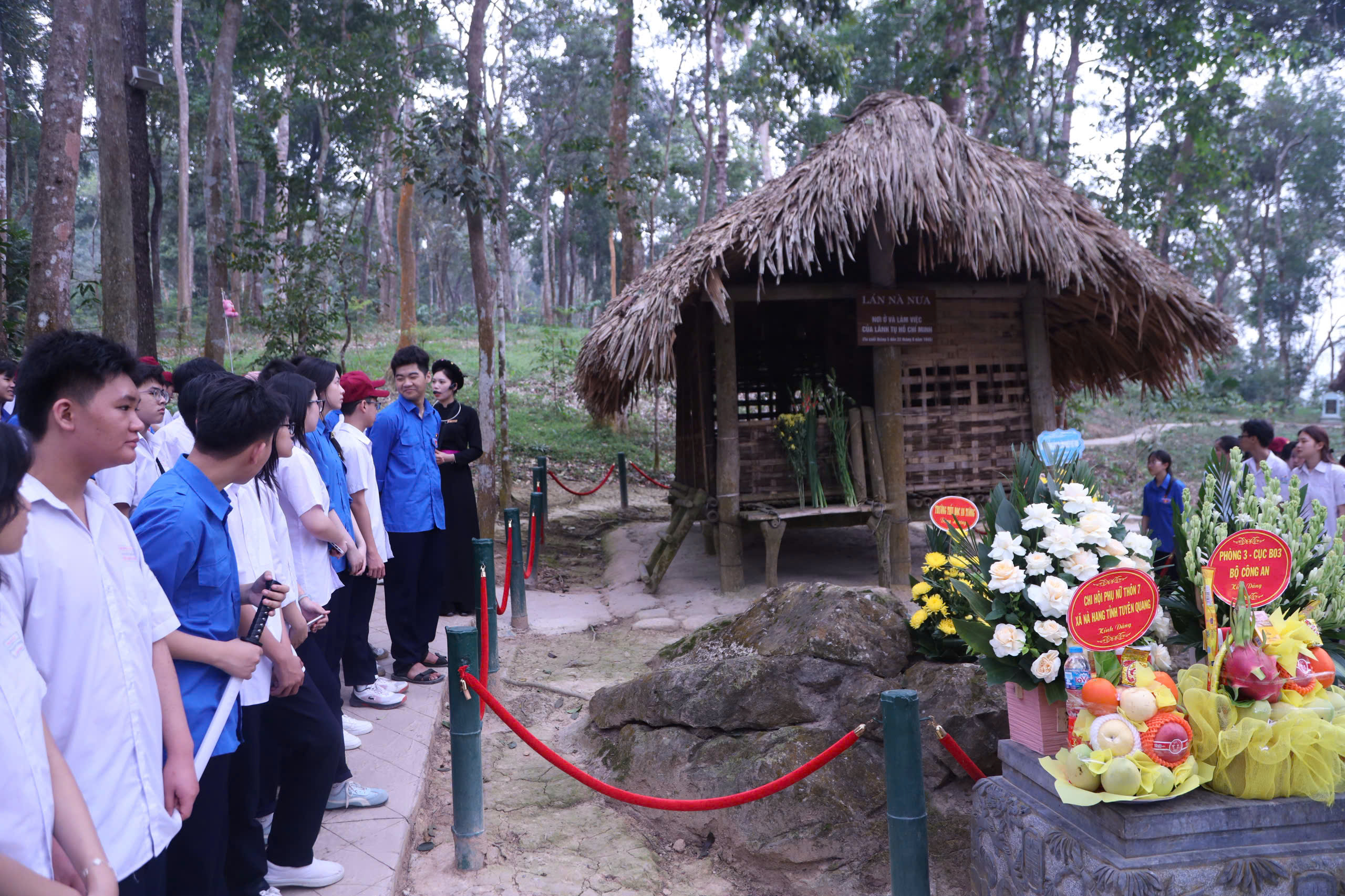 Tiếp nối hành trình, học sinh được tham quan các địa danh lịch sử tiêu biểu như Lán Nà Nưa, Cây đa Tân Trào, Đình Tân Trào. Mỗi điểm đến không chỉ là một “di tích”, mà còn là một “không gian học tập sống động”, nơi lịch sử được tái hiện chân thực, giúp các em tiếp cận tri thức theo hướng trực quan, đa chiều.
