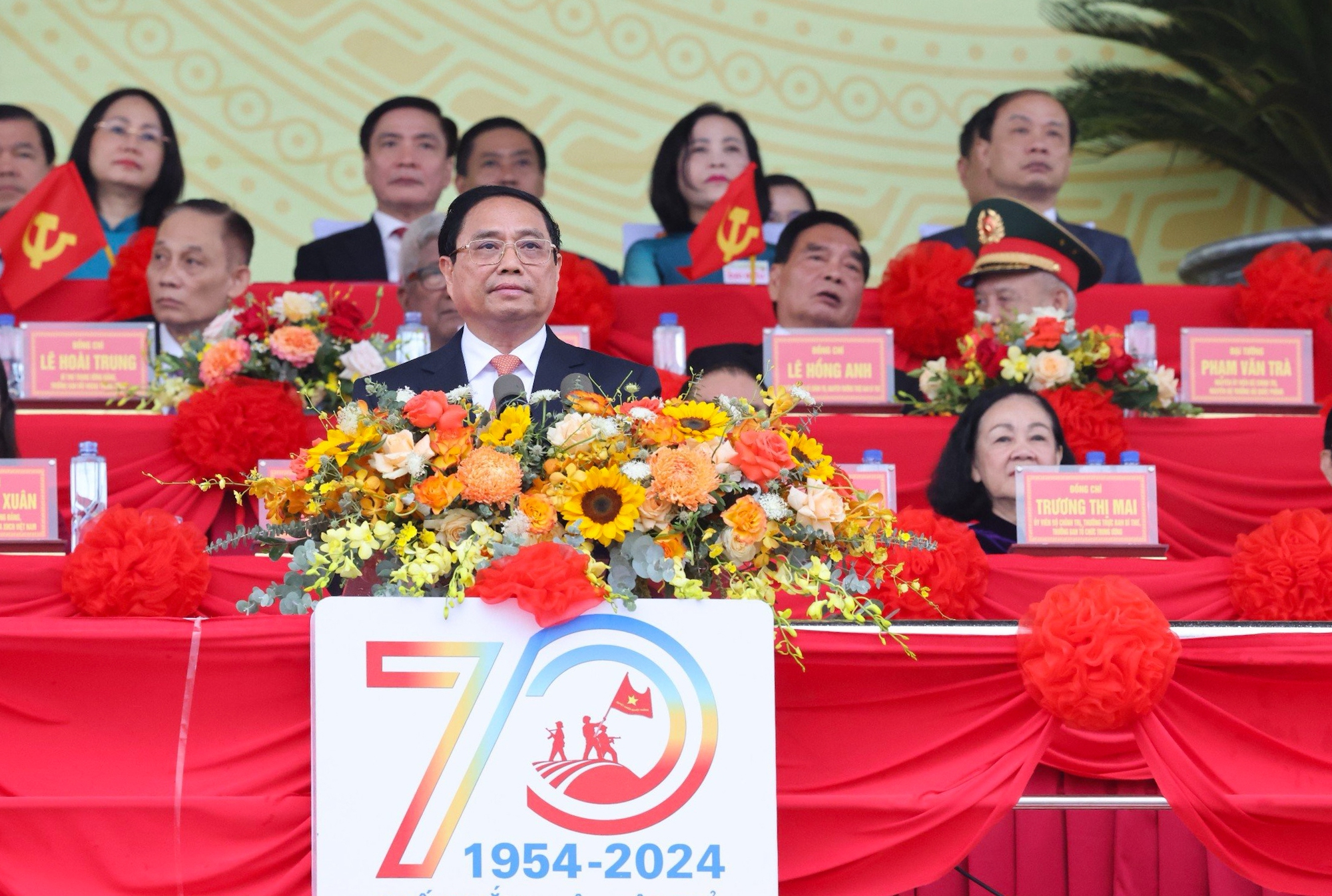 Đồng chí Phạm Minh Chính, Ủy viên Bộ Chính trị, Thủ tướng Chính phủ trình bày diễn văn tại Lễ kỷ niệm 70 năm Chiến thắng Điện Biên Phủ (1954-2024).