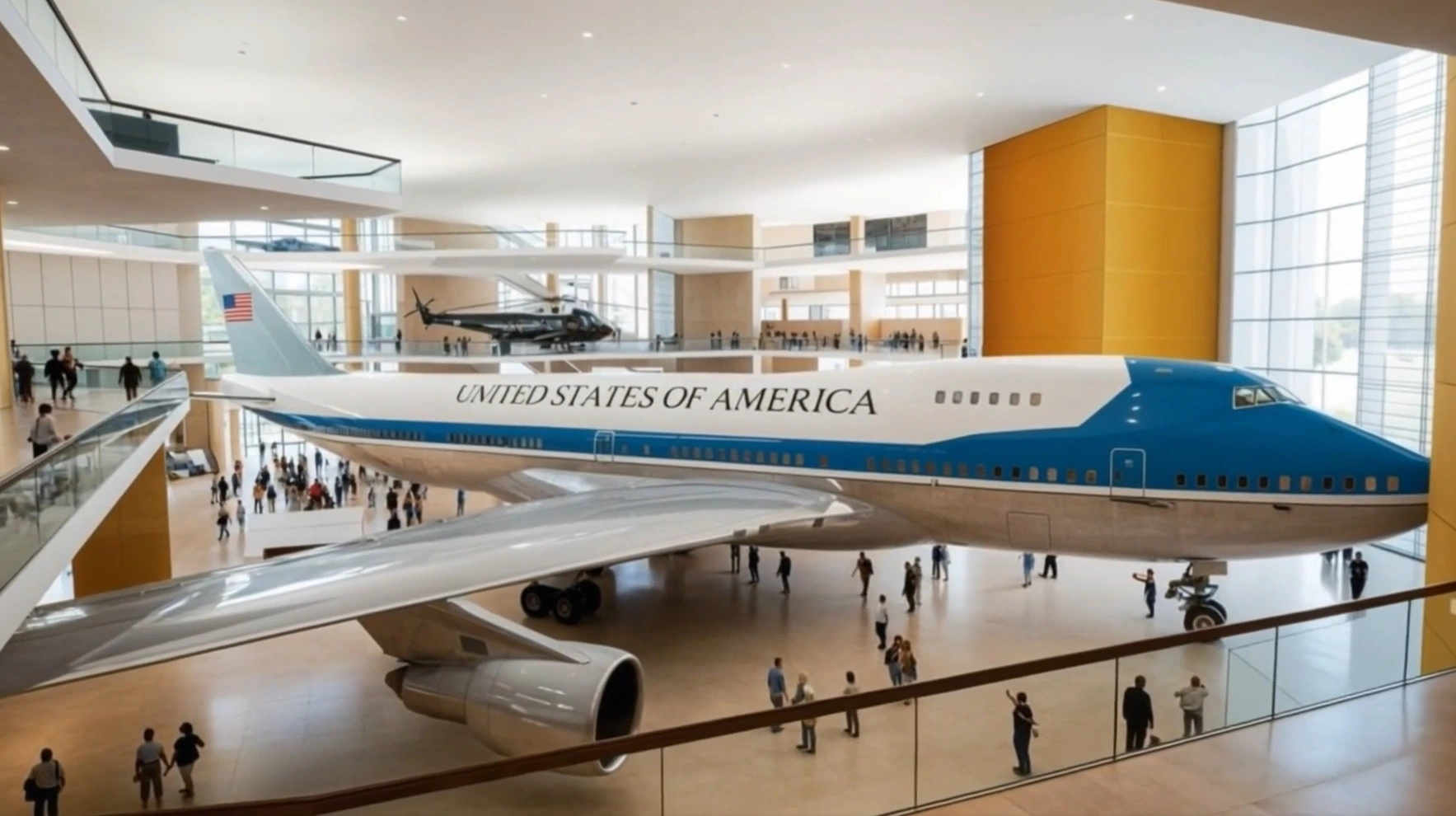 Đáng chú ý, ngay tại sảnh của thư viện là mô hình chuyên cơ Không lực Một (Air Force One). Được biết, đây là chiếc máy bay Boeing 747 mà chính phủ Qatar tặng nhà lãnh đạo Mỹ vào năm ngoái.