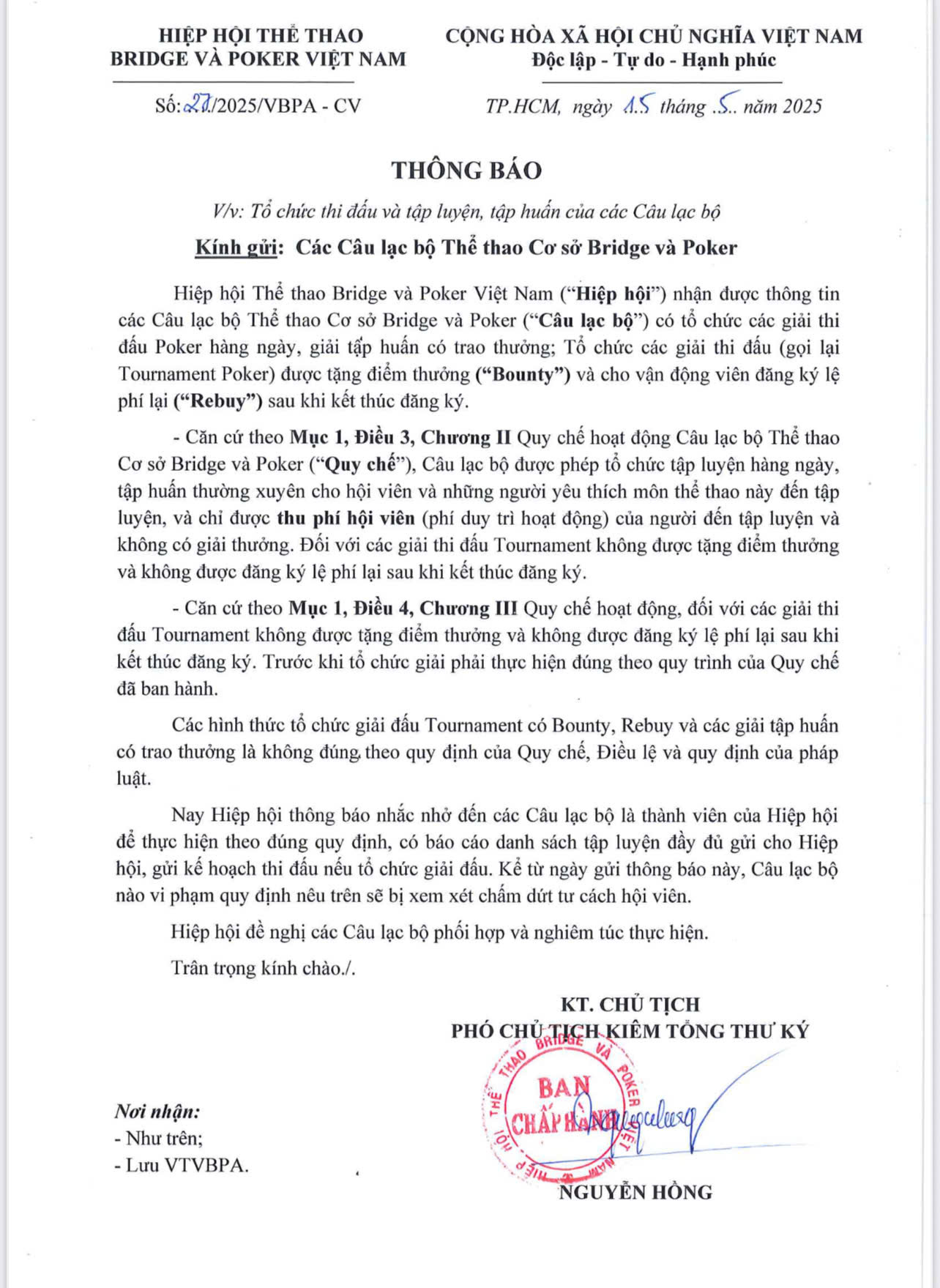 Thông báo của Hiệp hội Thể thao Bridge và Poker Việt Nam
