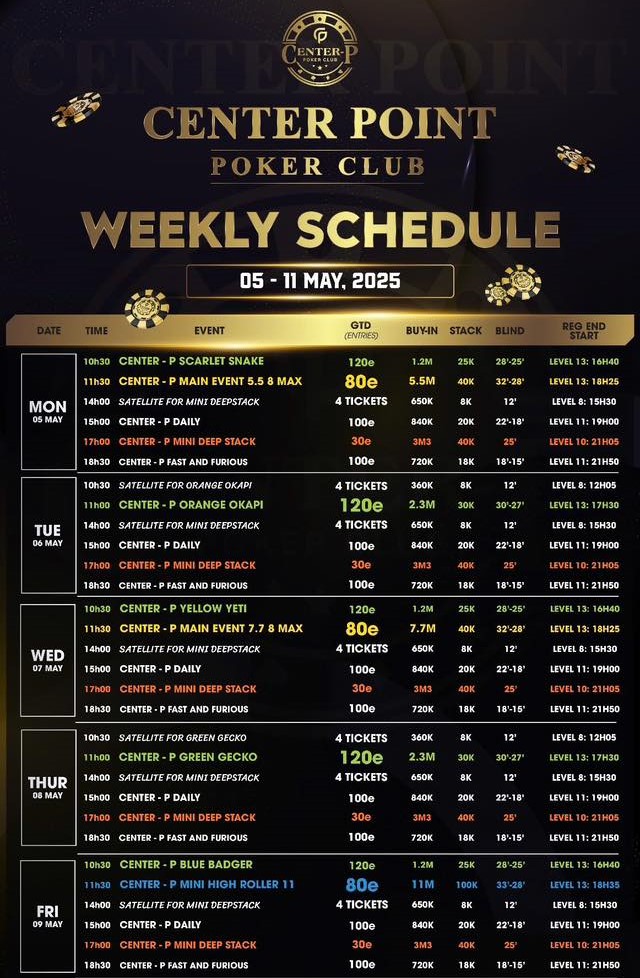 Câu lạc bộ Center Point tổ chức các giải đấu tập huấn hàng ngày với mức vé mua vào (BUY IN) từ vài trăm nghìn đồng đến 11 triệu đồng với tổng giải thưởng mỗi ngày có thể lên đến hàng tỷ đồng
