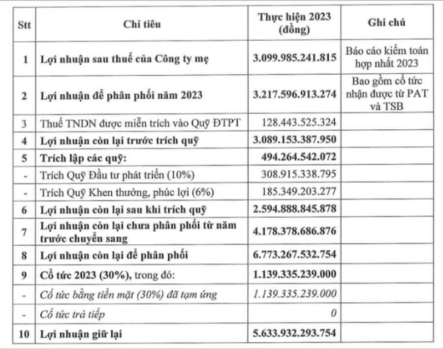 Về kế hoạch phân phối lợi nhuận, Tập đoàn Hoá chất Đức Giang trình cổ đông kế hoạch cổ tức năm 2023 với tỷ lệ 30% bằng tiền mặt, tương ứng số tiền là 1.139,3 tỷ đồng (đã tạm ứng cho cổ đông).